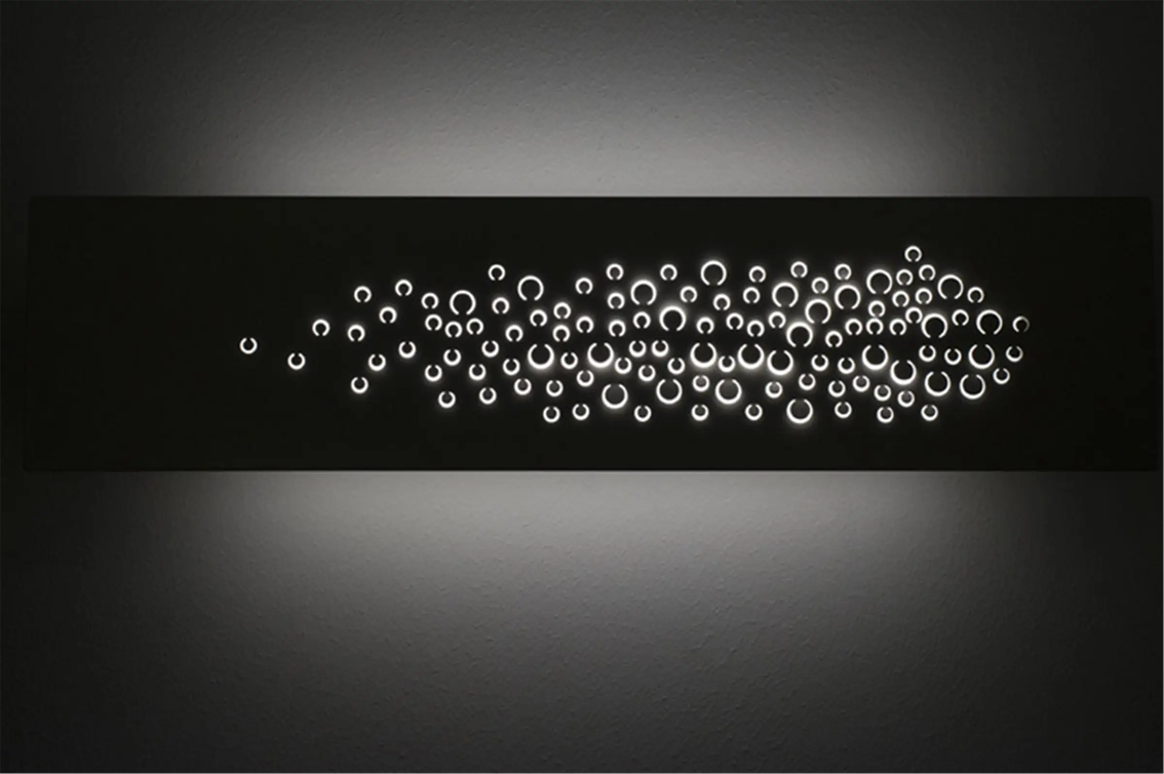 Islet è una applique elementare nella forma ma poetica nell'effetto di luce che la caratterizza.La sua superficie si anima attraverso i raggi di luce che fuoriescono dai tagli posti sul fronte della sua struttura. Tanti piccoli fori creati attraverso la piega della lamiera lasciano fuoriuscire la luce e la riflettono sulle piccole alette che la piega del materiale crea. Le superfici moltiplicano i riflessi diffondendo la luce e rendono la percezione variabile a seconda del punto di vista, nascondendo o incorniciando l'area dei fori resa luminosa dall'opalino che scherma la vista diretta delle sorgenti led. L'opalino chiude anche i lati superiore e inferiore per diffondere al meglio la luce senza creare abbagliamento.