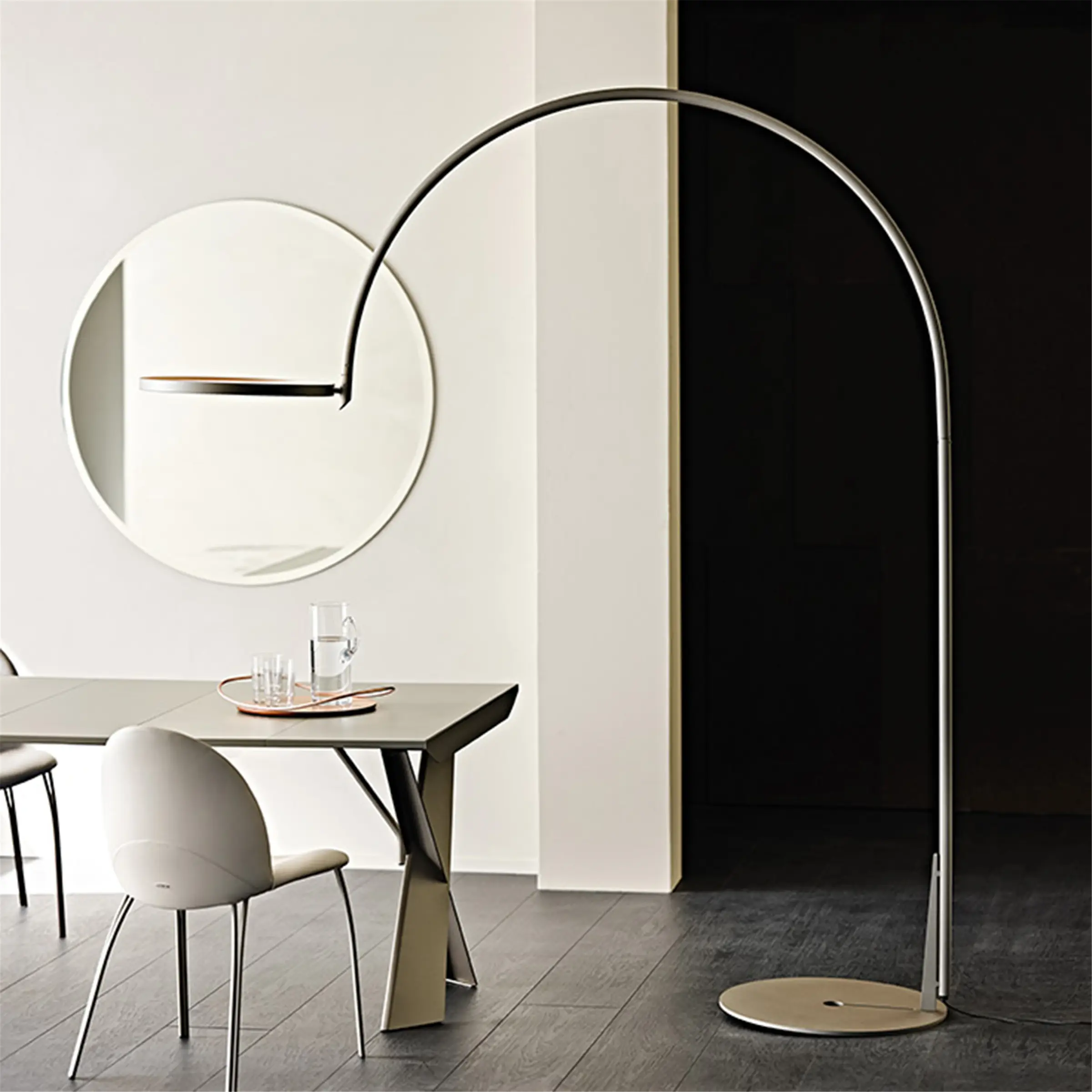 La piantana ad arco Arx è un progetto di Giorgio Cattelan. Interamente rifinita in metallo, questa lampada da terra moderna è un elemento distintivo della zona living, con un forte carattere decorativo. Questa piantana moderna è caratterizzata da un perfetto equilibrio geometrico. La base rotonda e piena, si contrappone alla circonferenza luminosa dall'altro capo della struttura arcuata. I dettagli decorativi sono minimali, ma non per questo meno d'impatto. Osservando la base della piantana di design è possibile notare un foro la cui forma sembra voler riprodurre la sezione della lampada vista dall'alto; a questa si unisce un solido triangolare slanciato, che collega l'ampio arco metallico alla base, rendendo la struttura più dinamica e originale. L'ultimo dettaglio elegante e discreto è il taglio diagonale all'estremità della struttura arcuata, che si unisce con delicatezza alla circonferenza dotata di luci LED interne.