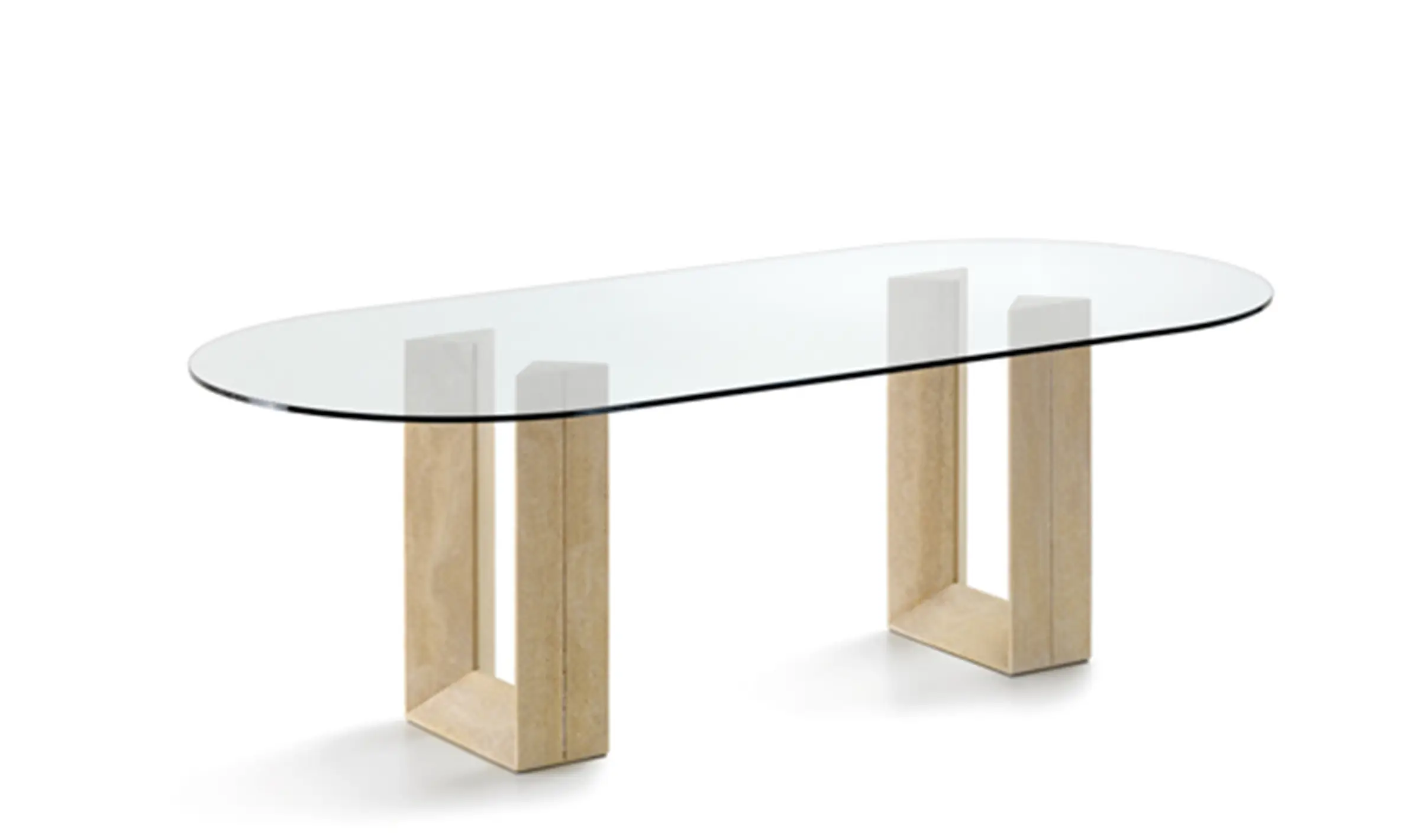Tavolo con base in travertino o bianco Carrara e piano in cristallo trasparente con spessore di 15mm. Piano in appoggio.