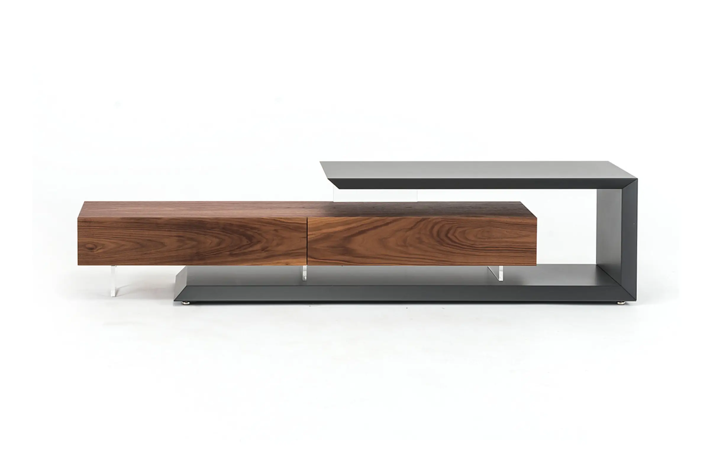 Mobile porta tv reversibile e adattabile in lunghezza con struttura verniciata goffrato bianco (GF71) o graphite (GF69). Cassettiera e ante in noce Canaletto (NC), goffrato bianco (GF71) o graphite (GF69).
