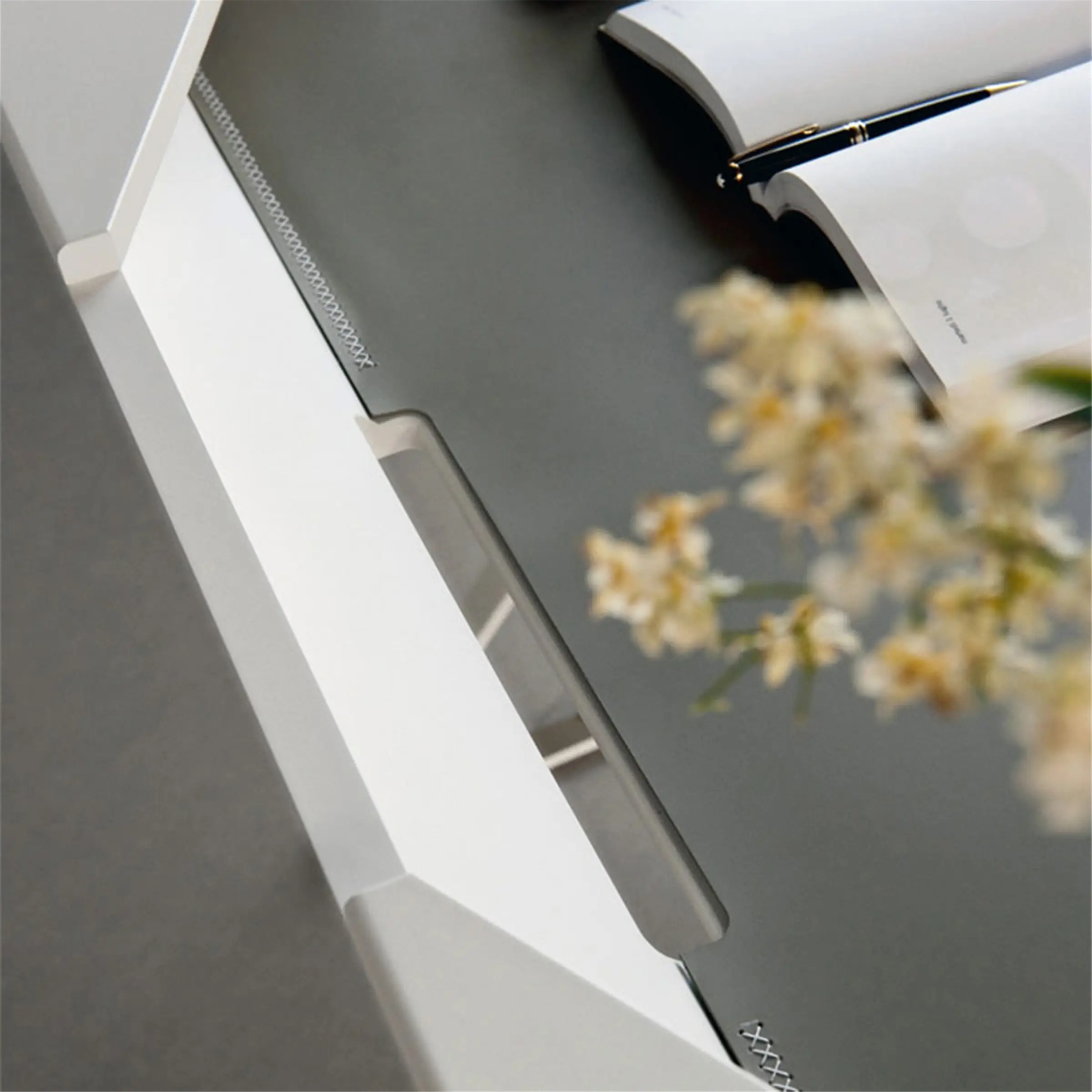 Scrittoio con struttura in acciaio verniciato bianco o graphite opaco e profili in acciaio inox. Piano in MDF verniciato bianco o graphite opaco. PAD in cuoio venduto separatamente.