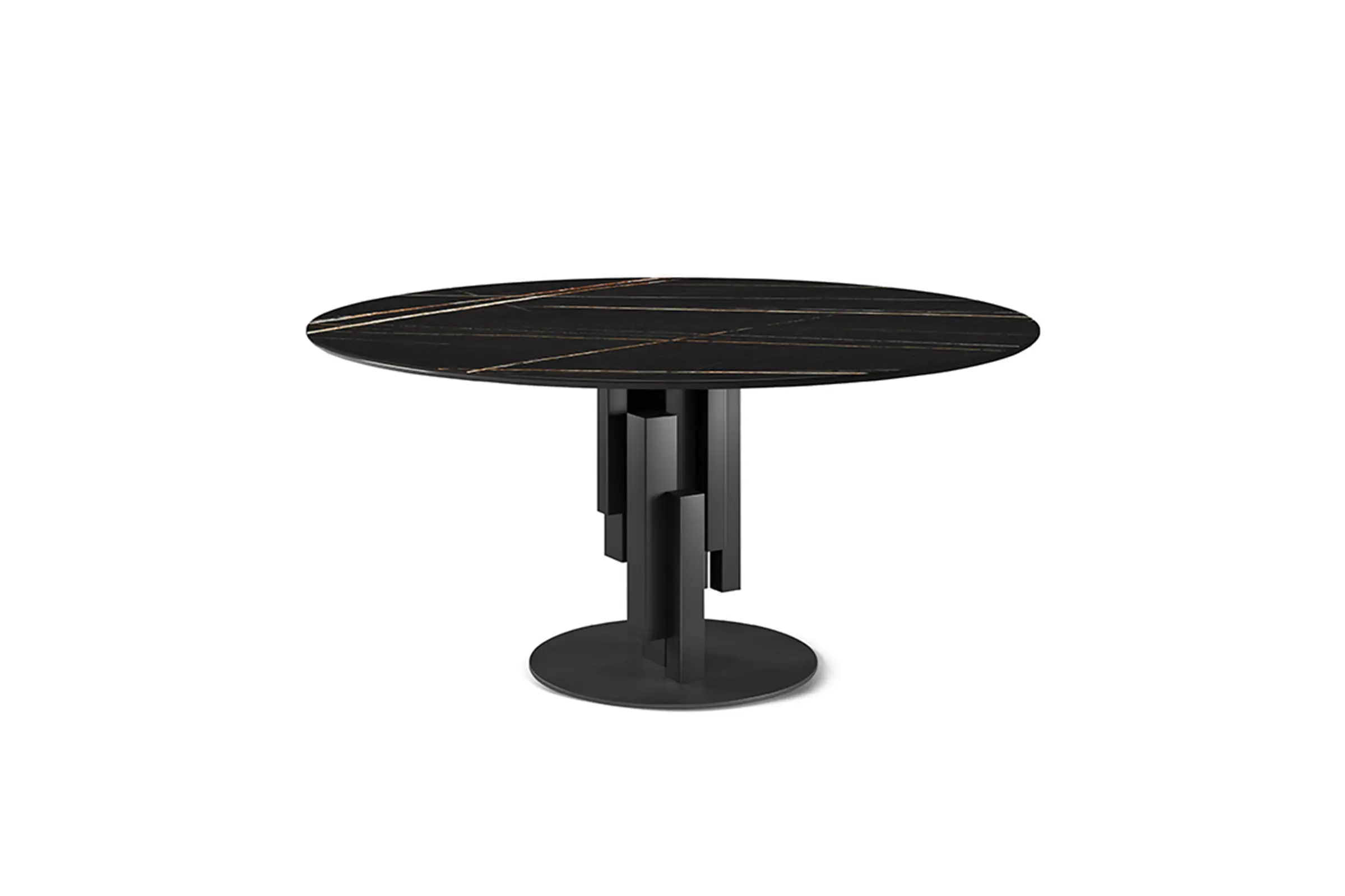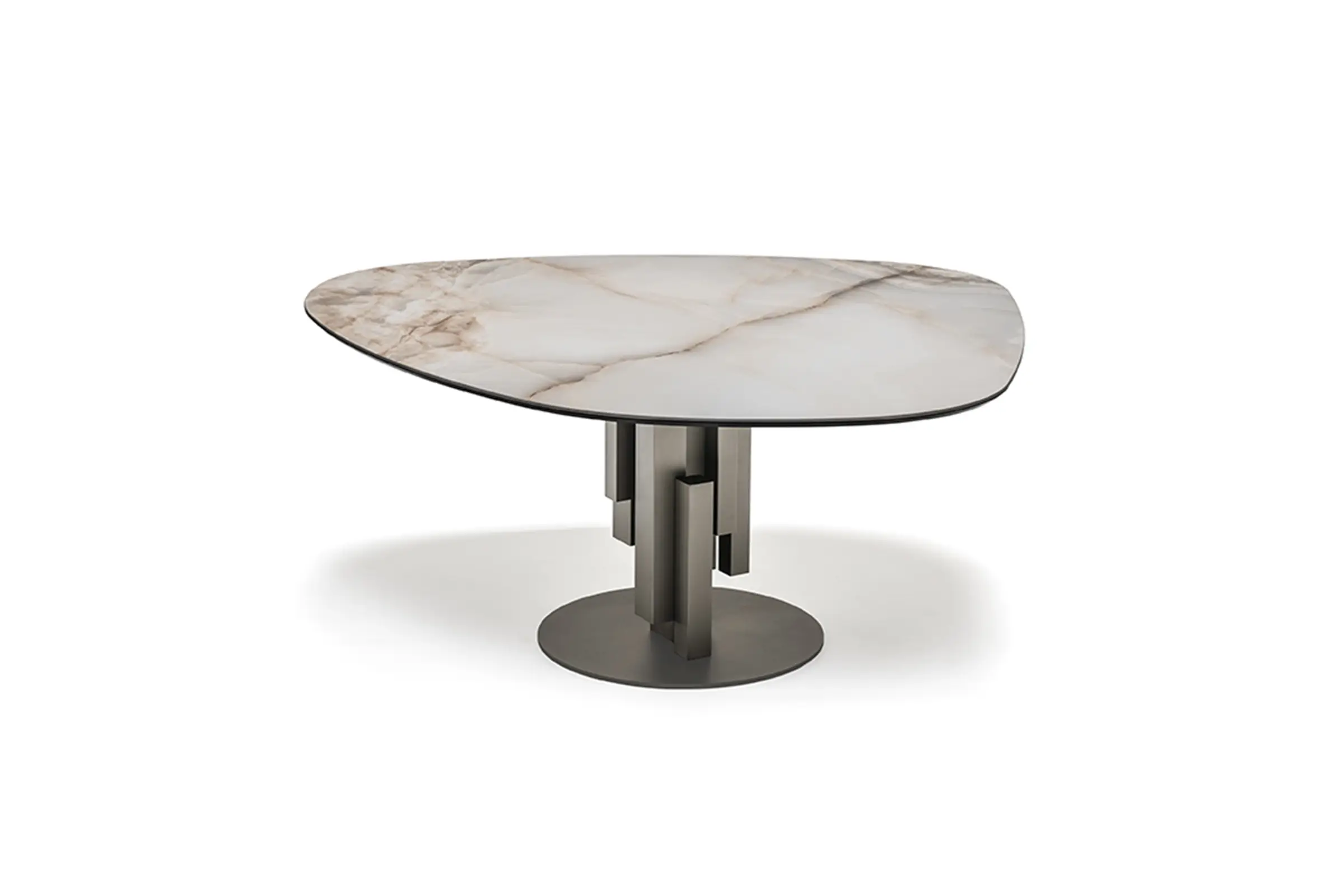 Tavolo con base in acciaio verniciato goffrato titanio (GFM11), graphite (GFM69) o nero (GFM73). Piano in ceramica Marmi nei colori Alabastro (KM02), Supreme (KM03), Ardesia (KM04), Golden Calacatta opaco (KM05), Golden Calacatta lucido (KM06), Portoro opaco (KM07), Portoro lucido (KM08), Sahara Noir lucido (KM09), Emperador (KM10), Makalu (KM11), Breccia (KM12) o Arenal (KM13).