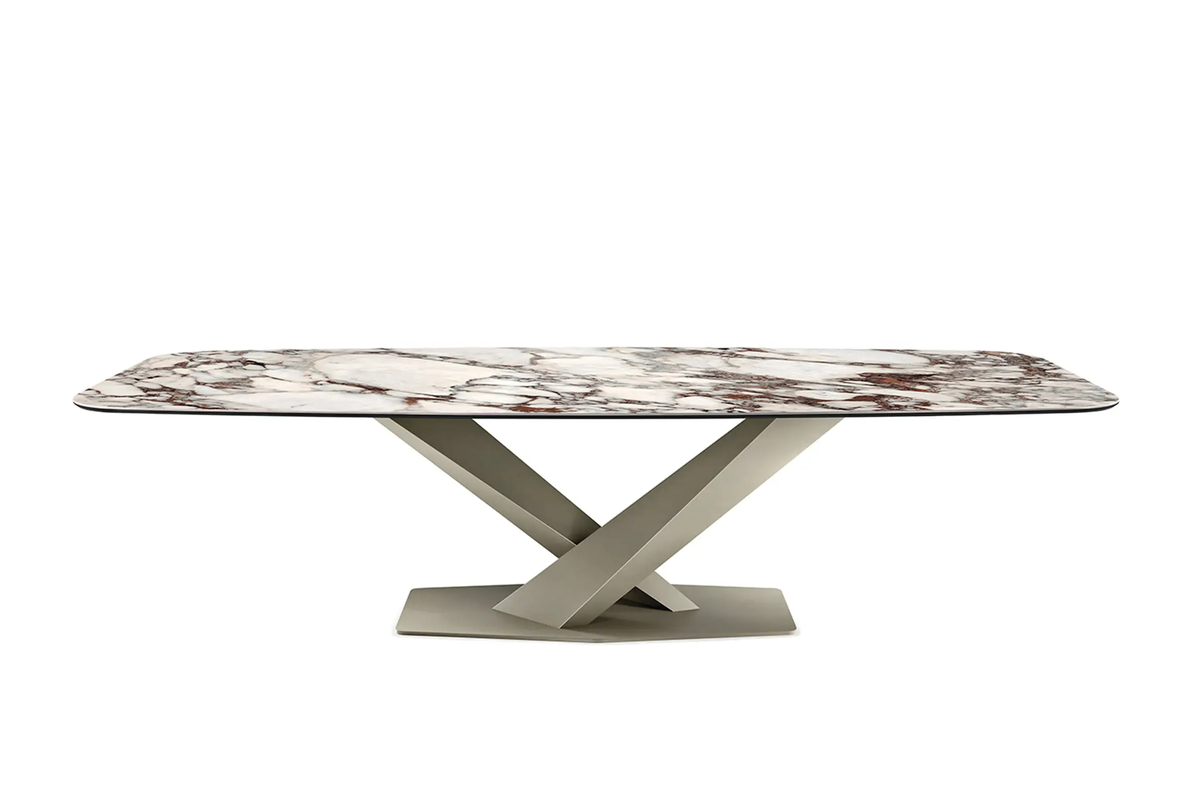 Tavolo con base in acciaio verniciato goffrato titanio (GFM11), bronzo (GFM18), graphite (GFM69), nero (GFM73). Piano in ceramica Marmi nei colori Alabastro (KM02), Supreme (KM03), Ardesia (KM04), Golden Calacatta opaco (KM05), Golden Calacatta lucido (KM06), Portoro opaco (KM07), Portoro lucido (KM08), Sahara Noir lucido (KM09), Emperador (KM10), Makalu (KM11), Breccia (KM12) o Arenal (KM13). Piano in appoggio.