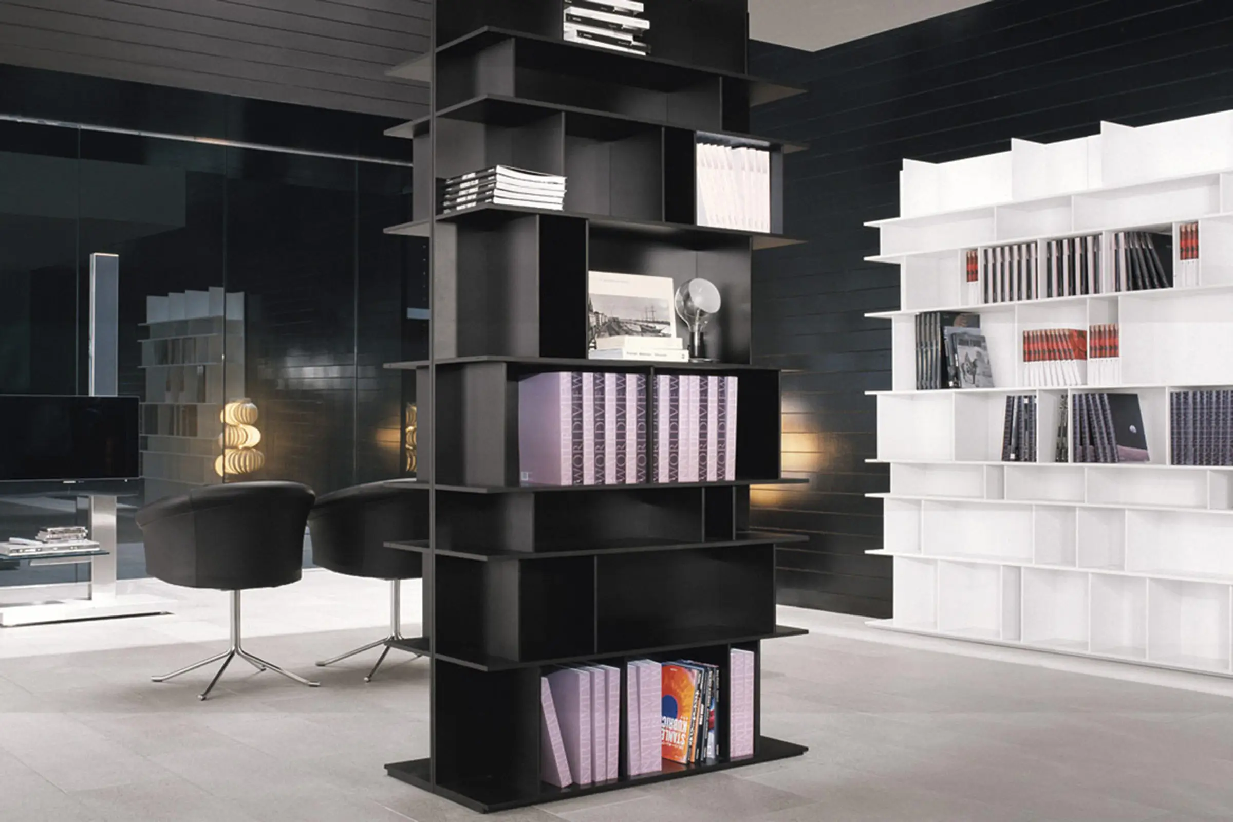 A muro, al centro della stanza, orizzontale, verticale, a uno o più moduli, sono infinite le soluzioni di questa libreria. I ripiani di differenti altezze consentono di poggiare libri e oggetti di misure diverse.