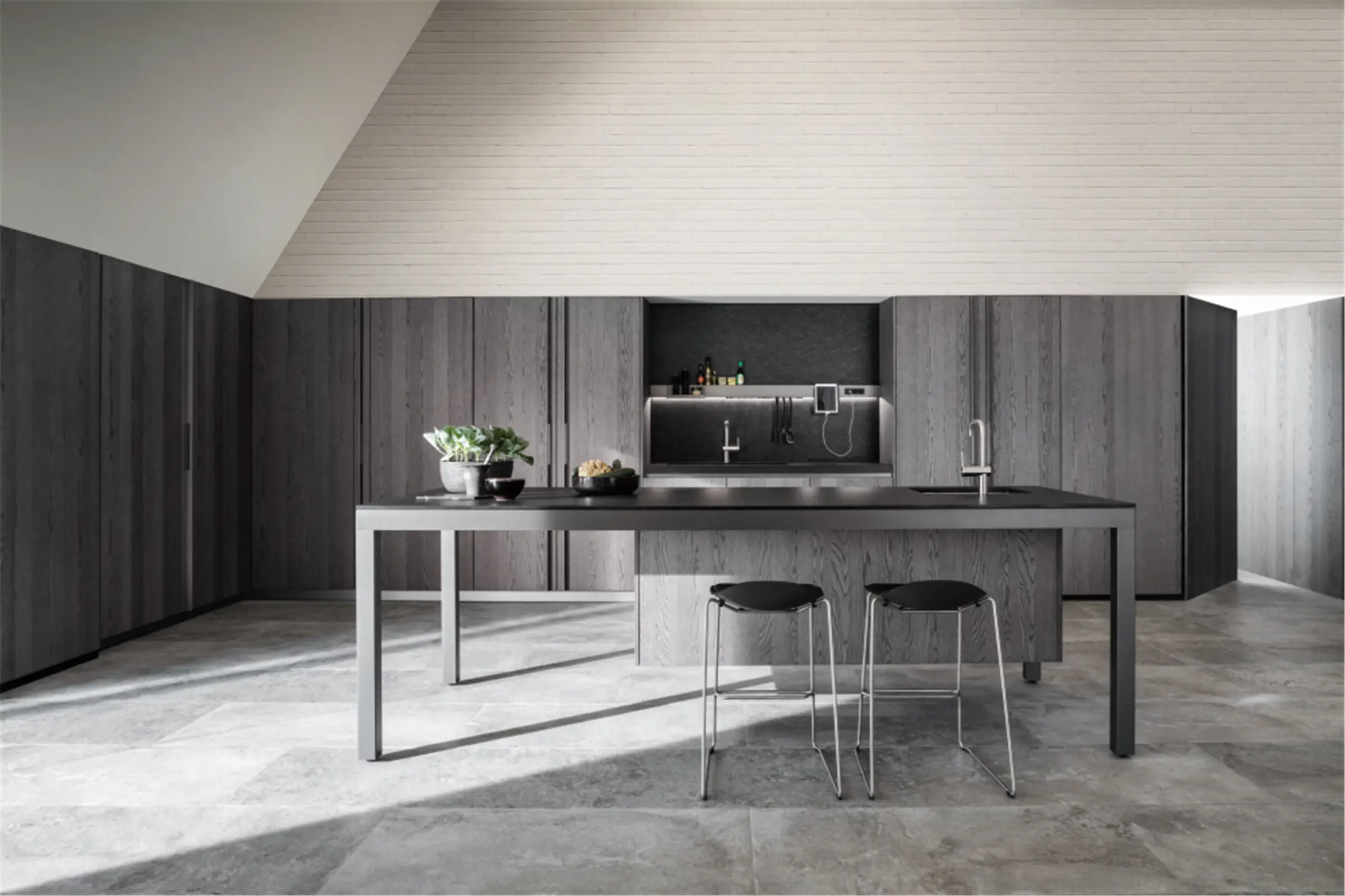 Una solida estrusione di alluminio sostiene la sottile linea del piano lavoro che definisce l’orizzonte dei volumi. La struttura rimane aerea, sospesa, e si completa con le basi a terra. La struttura a isola sostiene i contenitori sotto-Banco. Il piano ha uno spessore minimo e si adagia nella struttura in alluminio, nascondendo la sua anima massiccia.
