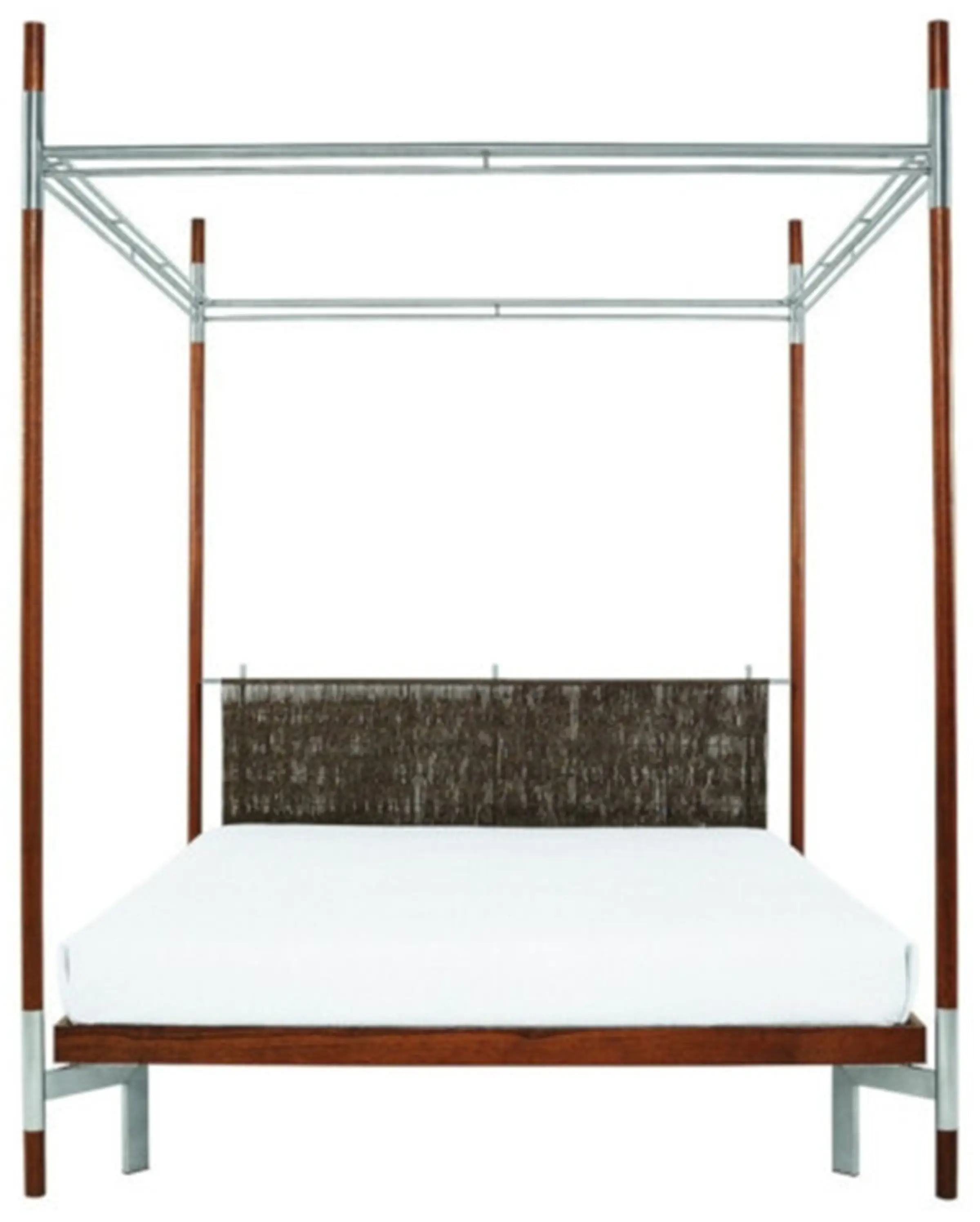 Struttura in acciaio inox satinato. Piano in legno massello di merbau. Testiera in acciaio inox rivestito in corda intrecciata. Materasso non incluso. Uso solo interno.