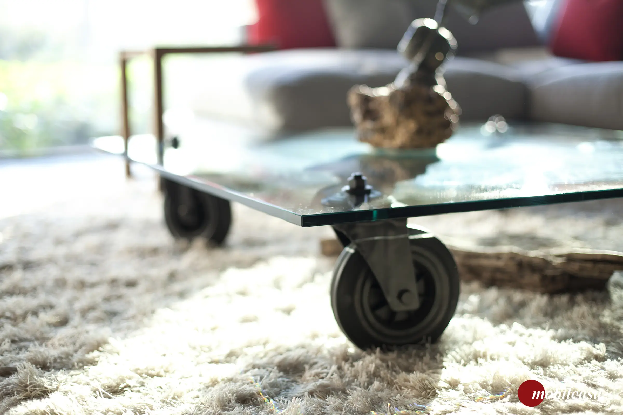 Un carrello industriale utilizzato nella sede di FontanaArte per il trasporto di vetri: è questo l’oggetto che ha ispirato Gae Aulenti nella progettazione di Tavolo con Ruote, esempio di una progettualità intuitiva nata dall’associazione con strumenti di uso quotidiano e tradotta in prototipo senza passare per il disegno. Nel progetto di Tavolo con Ruote il piano di legno del carrello industriale viene sostituito con una spessa lastra in vetro molato -simbolo della storia produttiva dell’azienda – a cui vengono fissate le rotelle industriali a movimento libero. E’ così che la sostituzione di un semplice elemento trasforma la natura dell’oggetto e la sua destinazione d’uso.