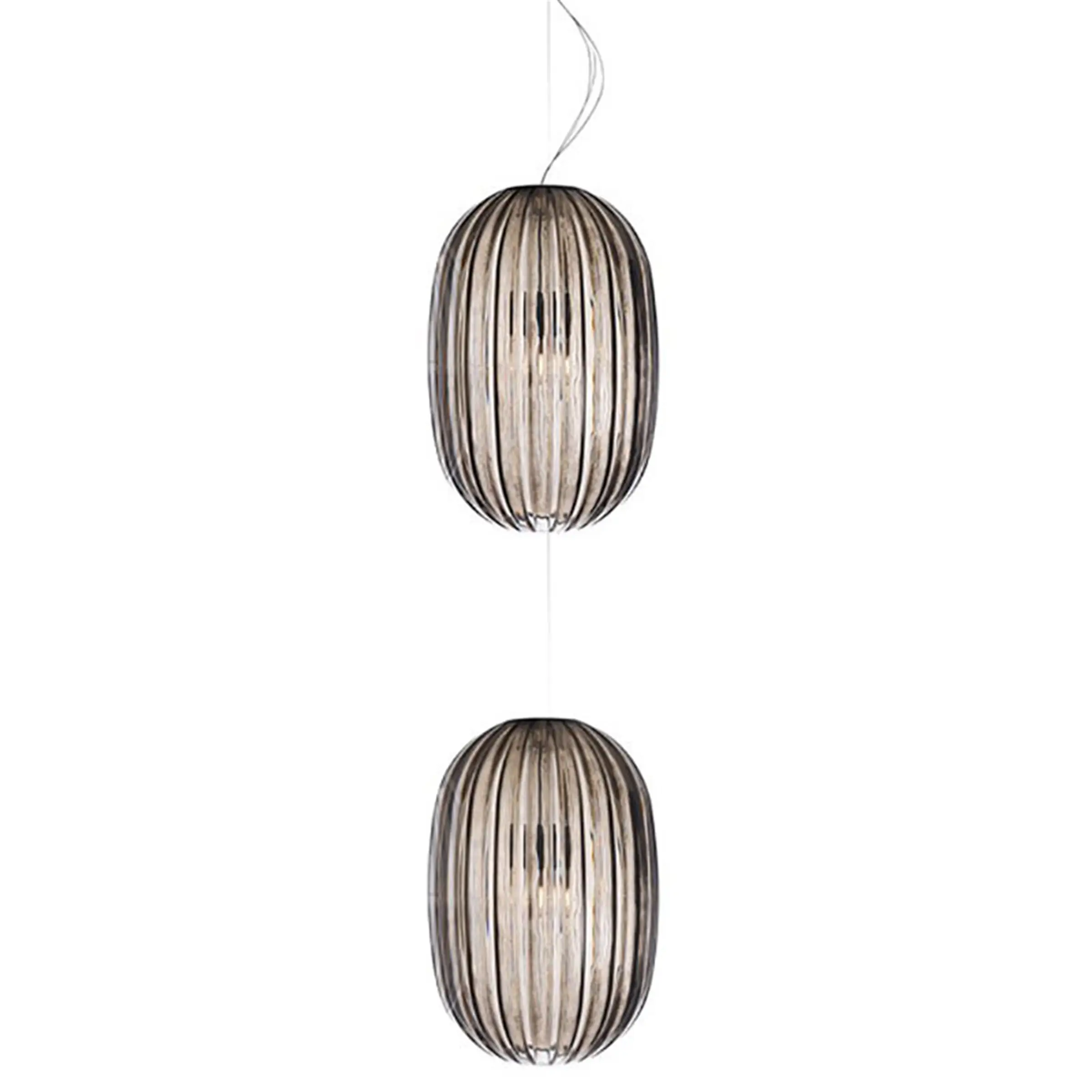 Plass porta su grande scala il fascino delle perle di vetro della tradizione veneziana, a cui si ispira nella forma e nei colori. Una lampada a sospensione la cui superficie singolare, volutamente “imperfetta”, vibra di luce dall’interno.