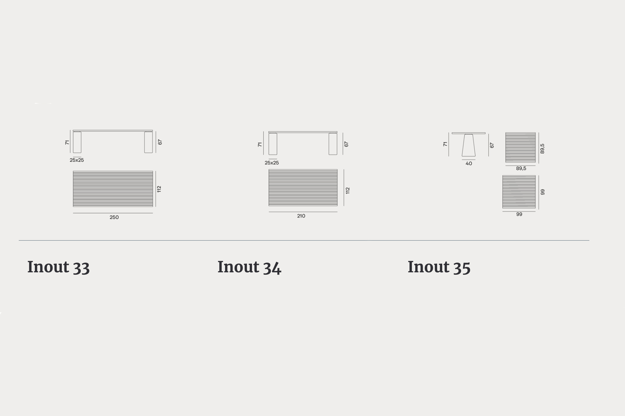 Famiglia di tavoli nata dall’unione di materiali naturali e di ultima generazione, Inout 33/34/35 sono disponibili in diverse dimensioni: con top rettangolari o quadrati di diverse grandezze. Sono realizzati con piano a doghe di teak naturale e gambe in cemento GFRC blu, bianco o grigio antracite, di forma rettangolare o trapezoidale. Inoltre i tavoli con piano rettangolare, avendo dimensioni più importanti, hanno anche la struttura portante in acciaio.