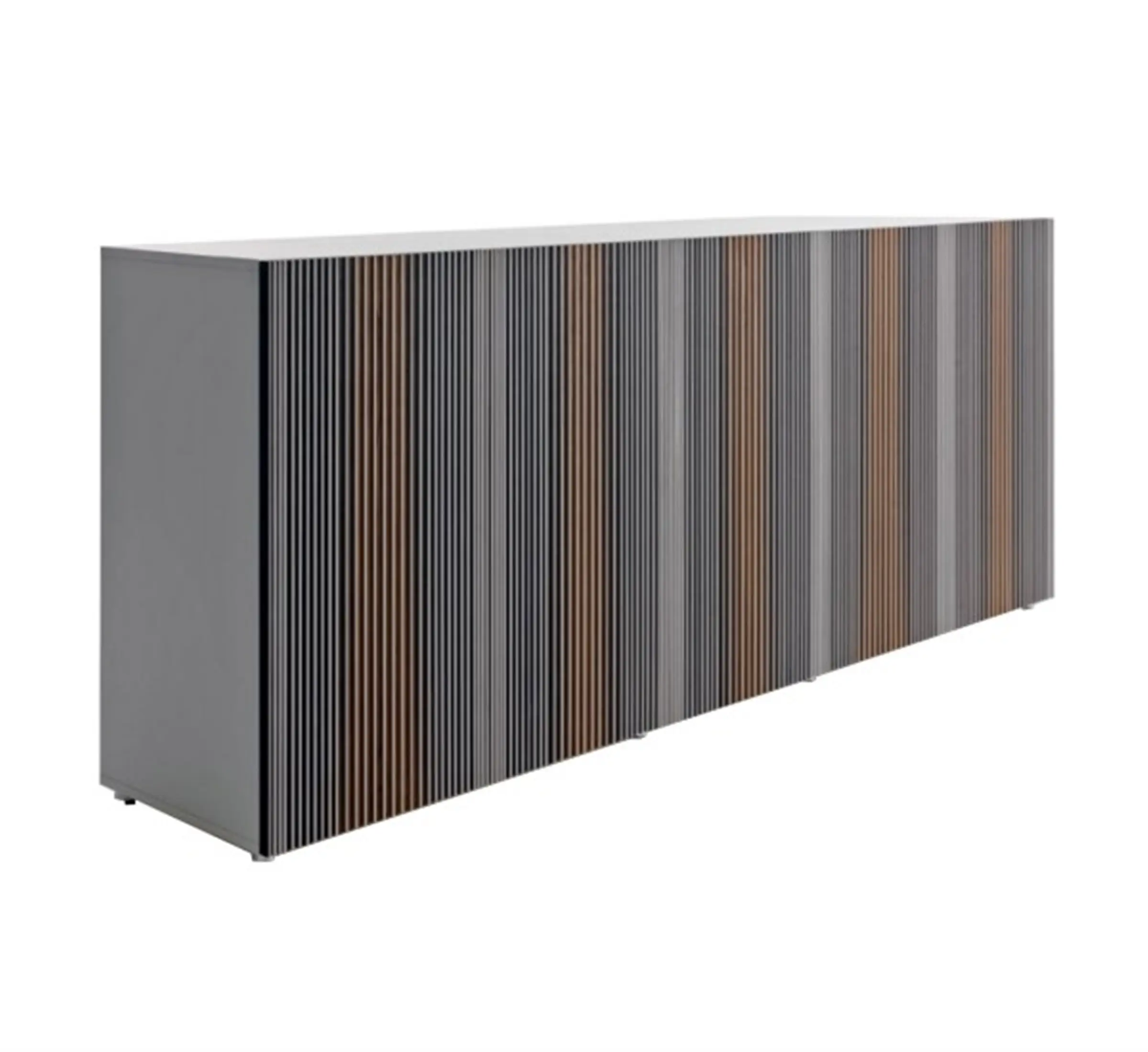 Carlos è caratterizzata da un motivo grafico di grande impatto visivo: chi si trova a guardare questa madia non è solo un passivo spettatore ma un vero e proprio attore, in quanto spostando il proprio punto di vista, potrà vedere cambiare interattivamente il colore del frontale, percependo la variazione cromatica come un dinamico sipario aprirsi e chiudersi. Carlos rivoluziona l'area living con personalità e un carattere deciso.