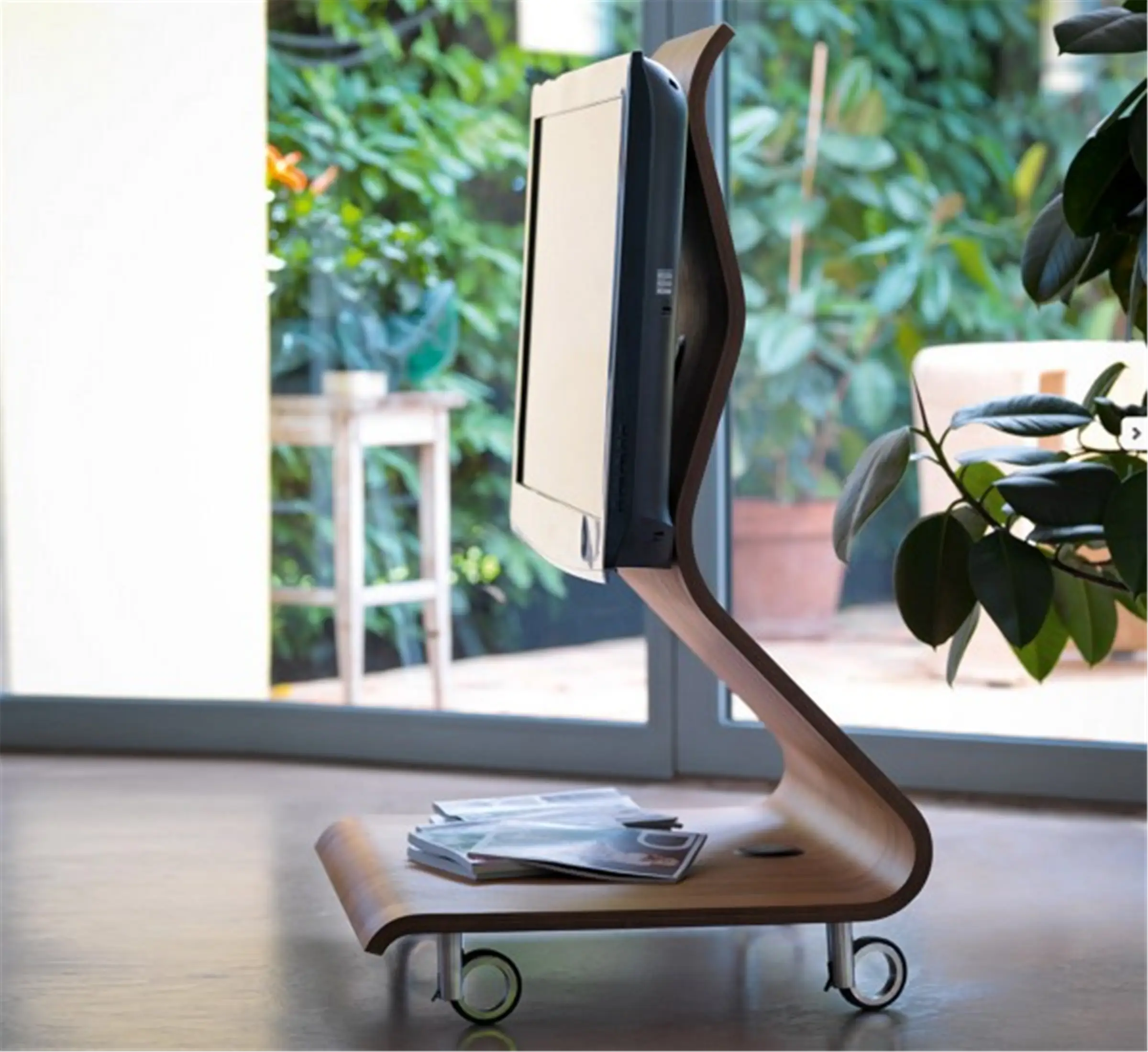 Cobra è un mobile porta-tv firmato da Mario Bellini nel 2006 per il brand Horm. Un design unico e sinuoso in legno multistrato piegato a caldo.Interamente levigato a mano e dotato di ruote frenanti, Cobra nasconde anche una luce d’atmosfera che si proietta sul pavimento. Accessoriato con prese multiple per l’alimentazione dei possibili componenti audiovisivi da appoggiare sul ripiano, ha un passacavi nascosto e discreto. Il canale passacavi posteriore è coperto da una fascia in velcro a strappo di spessore mm 3, impiallacciata in legno nella stessa finitura del mobile. Ruote in acciaio con freno di bloccaggio a pedale e battistrada in gomma poliuretanica anti traccia nera.Kit per aggancio televisore in dotazionePresa multipla di corrente a scelta (modello Shucko CEE 7/7, modello UK, modello USA)luce LED d’ambiente posizionate sotto la base