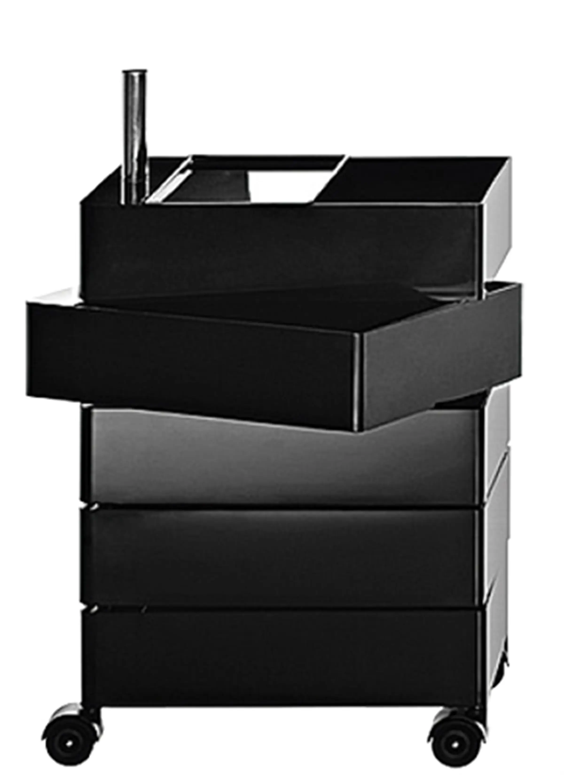 Cassettiera su ruote. Disponibile in 2 altezze. Materiali: ABS lucido. Tubo di collegamento in alluminio.