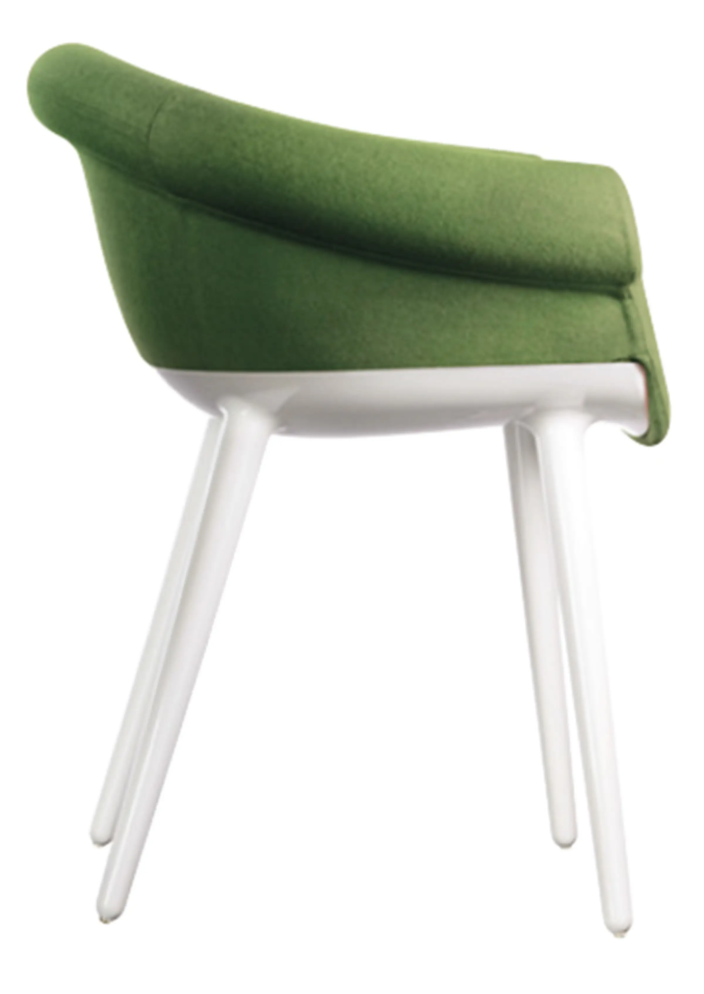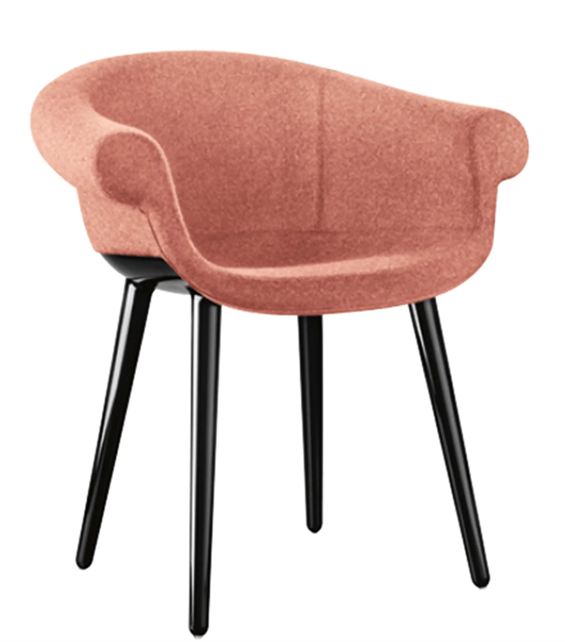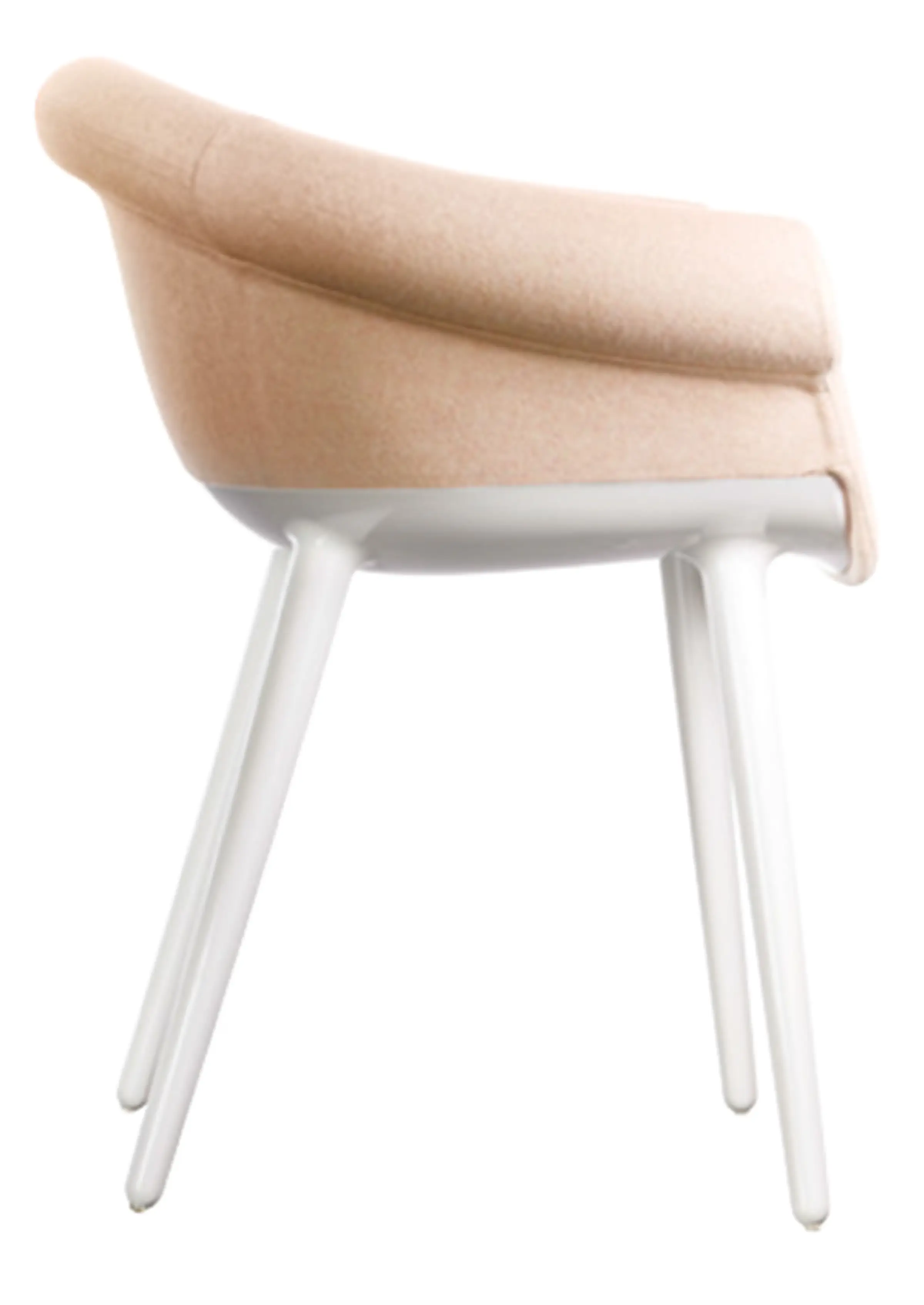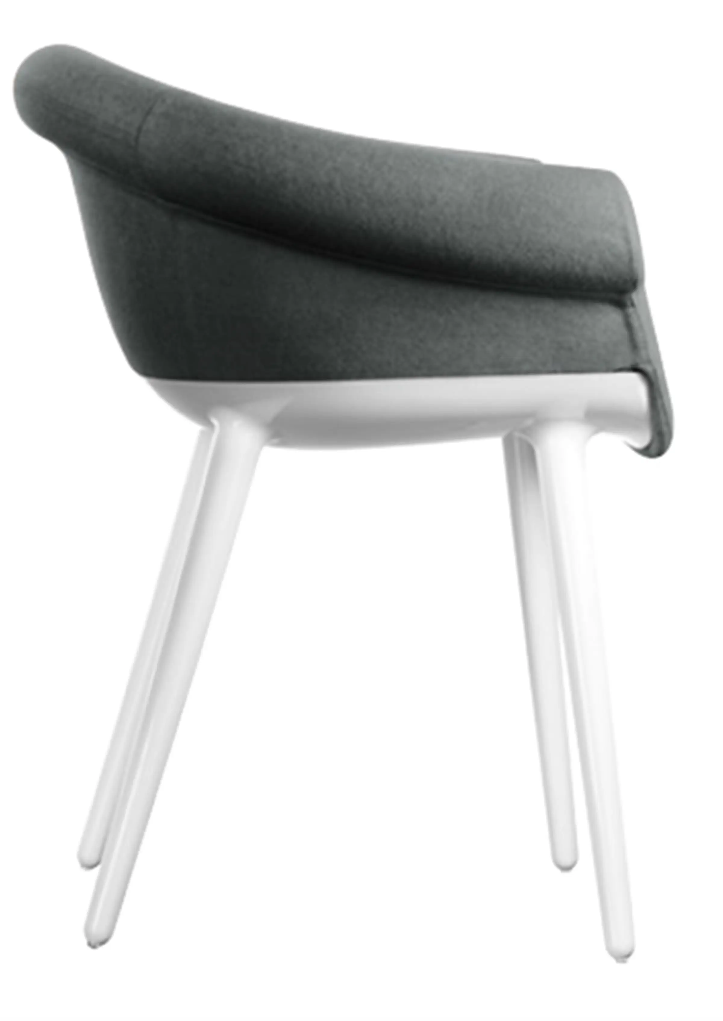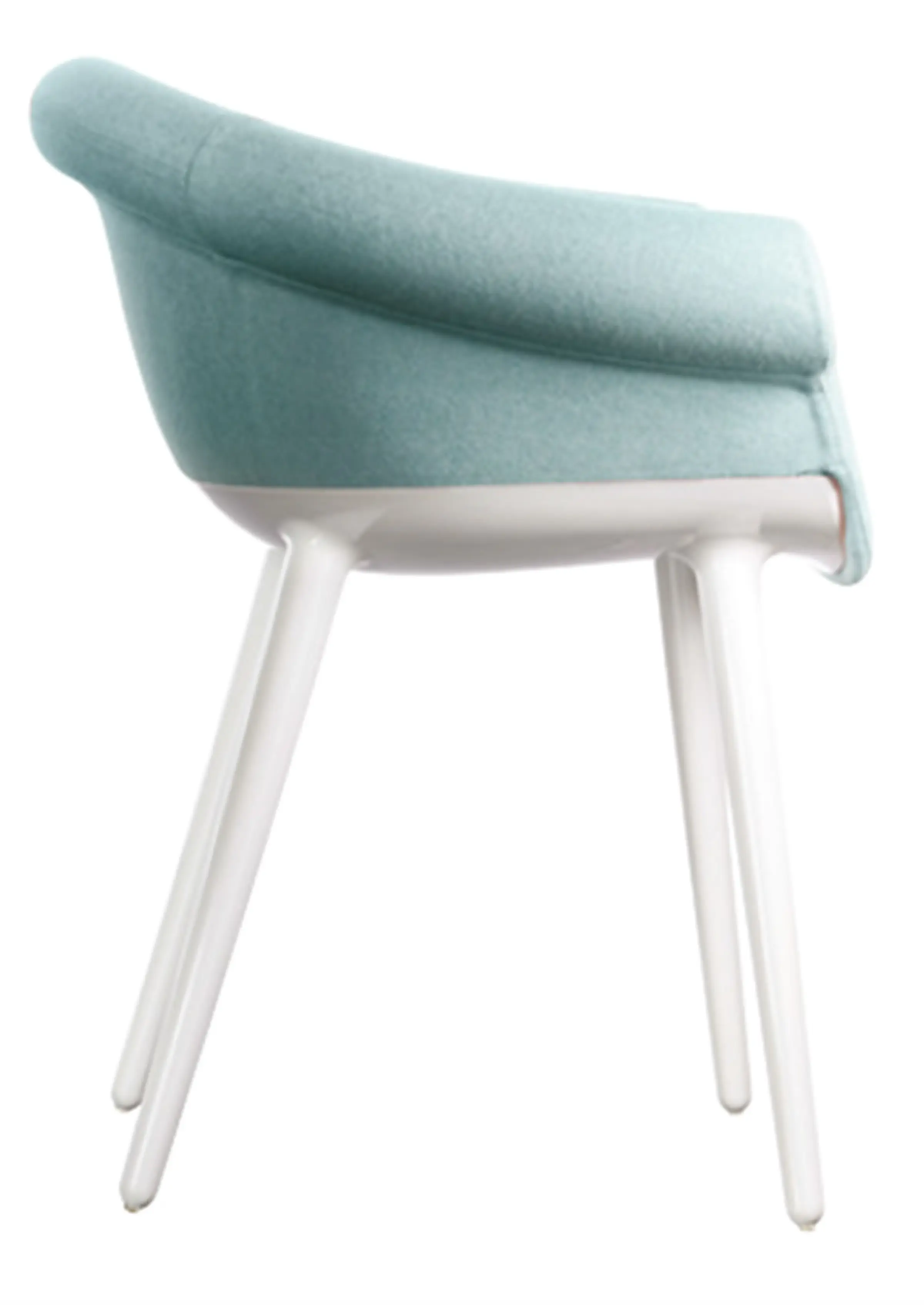 Poltroncina. Materiali: struttura in policarbonato stampato in air moulding. Sedile e schienale in poliuretano espanso schiumato ignifugo (classe 1IM) rivestito in tessuto (Kvadrat “Divina MD” e “Divina Mélange) o in pelle.