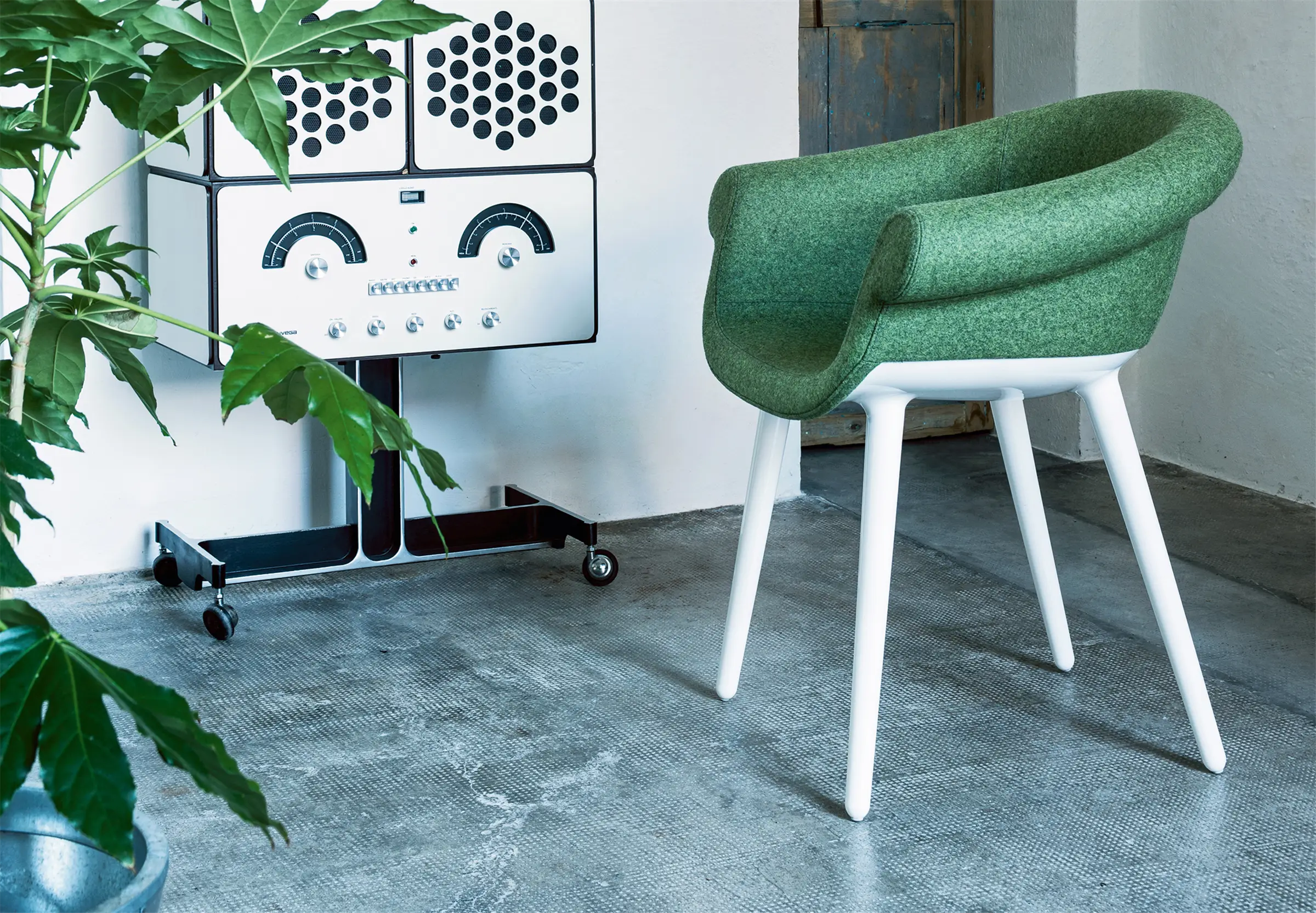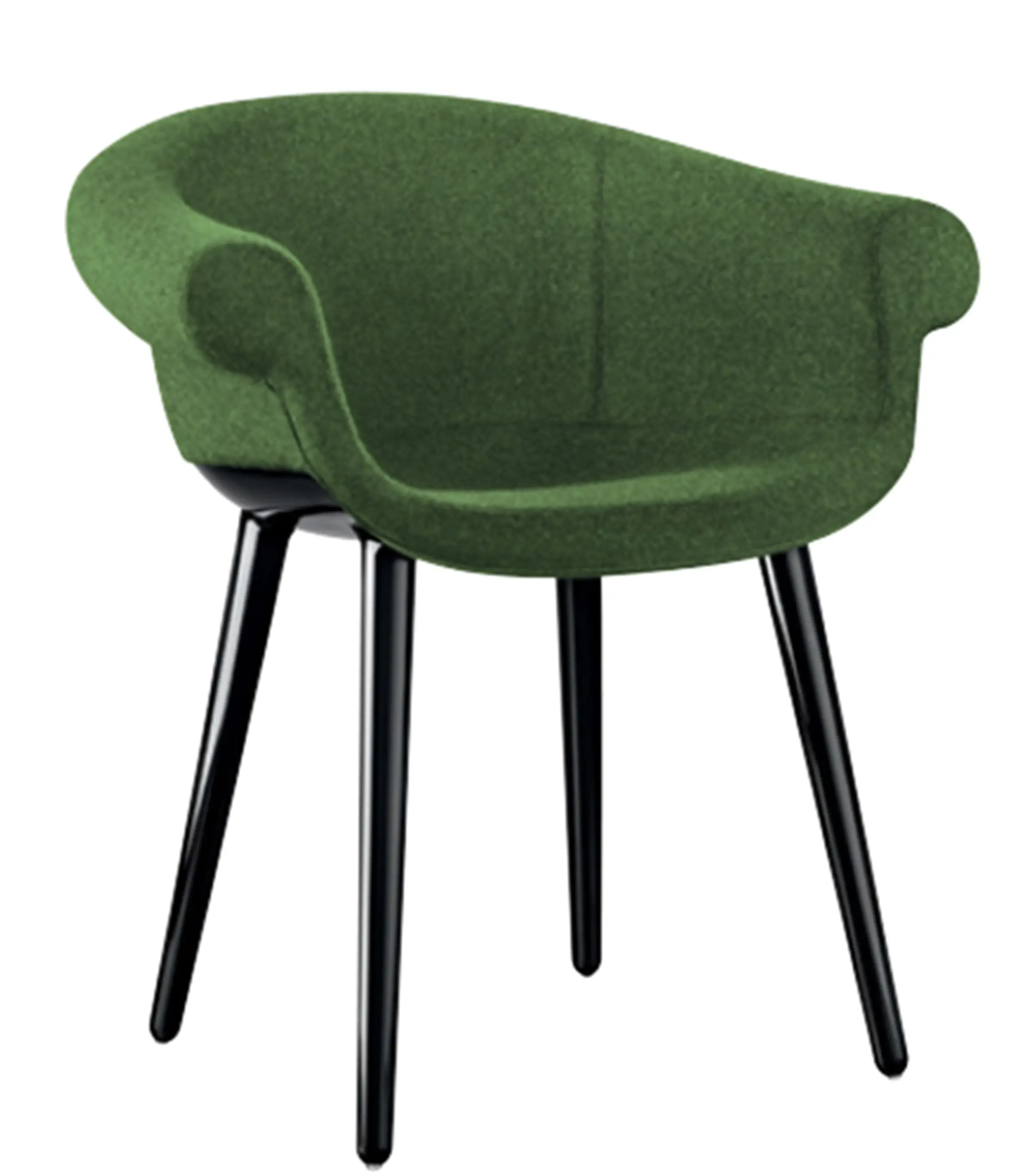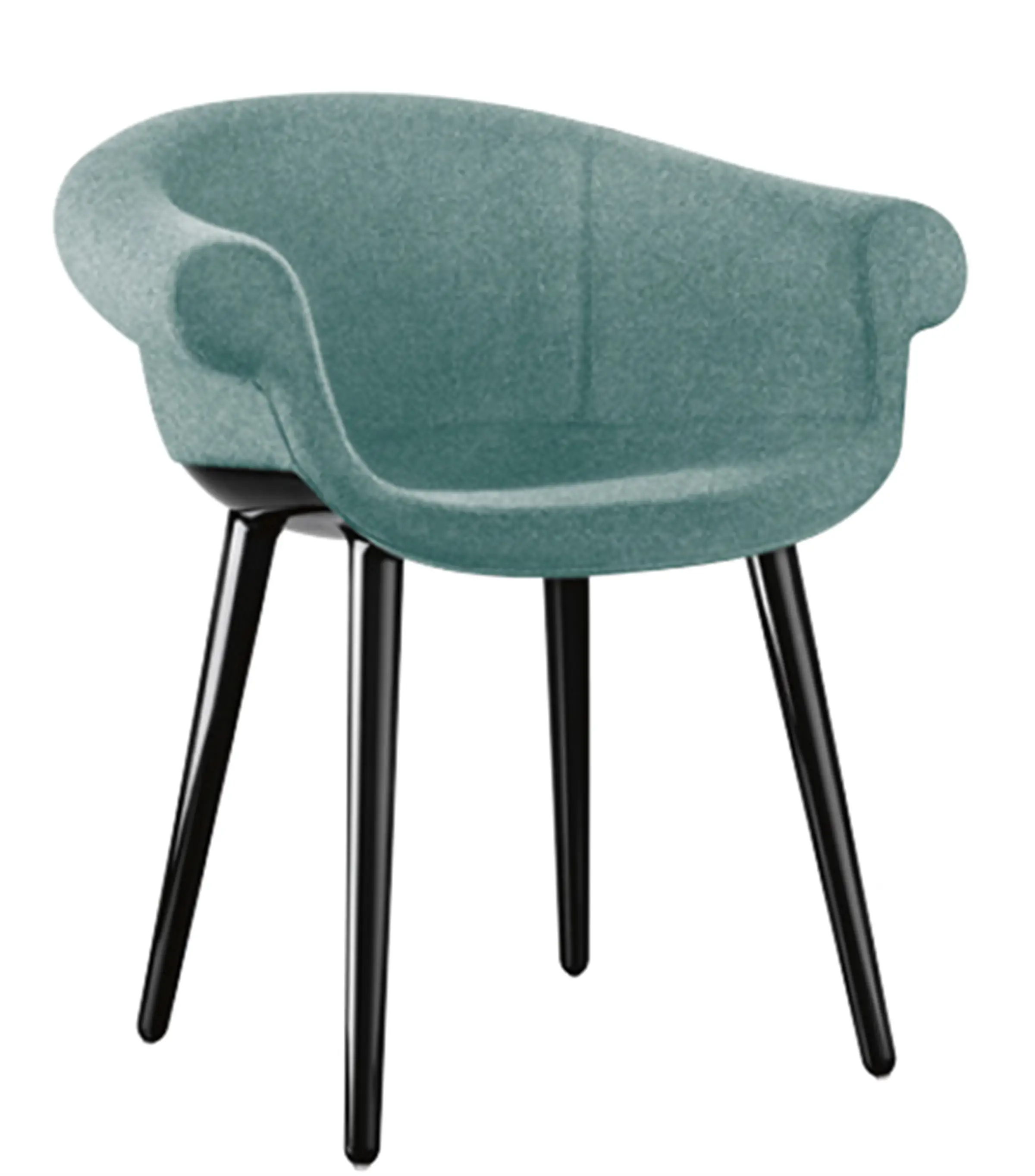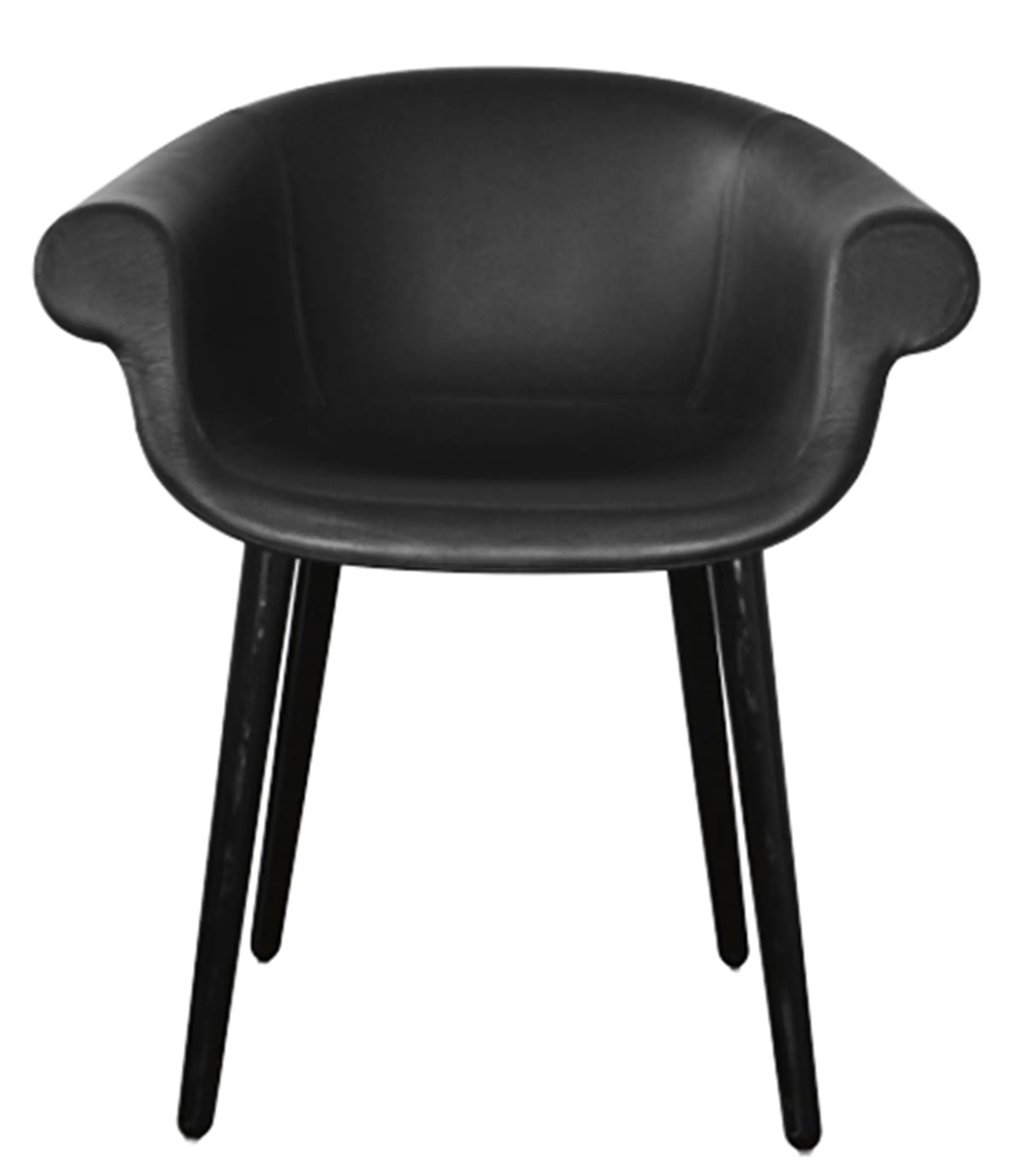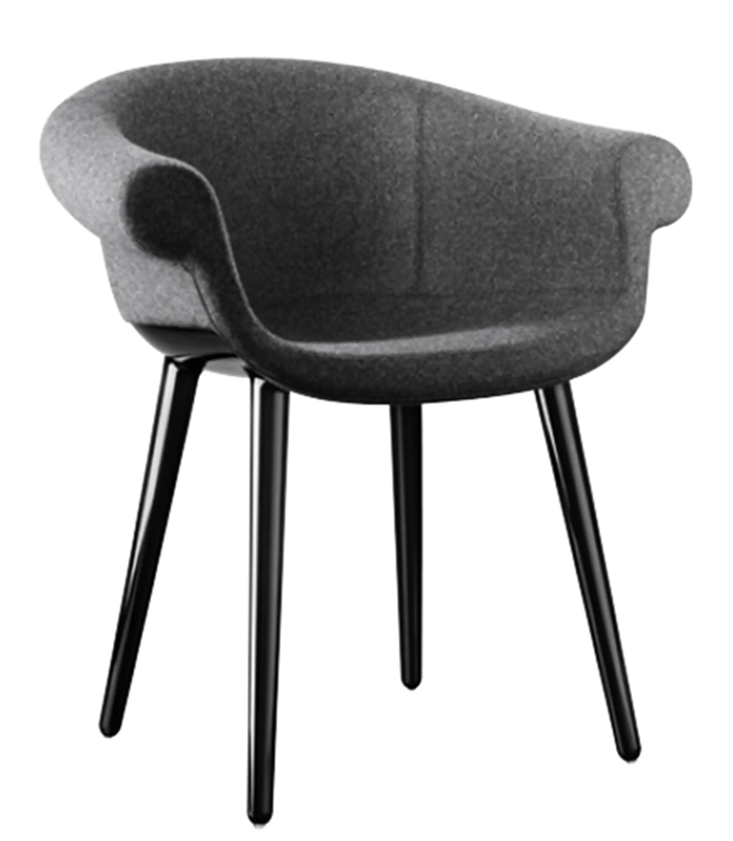 Poltroncina. Materiali: struttura in policarbonato stampato in air moulding. Sedile e schienale in poliuretano espanso schiumato ignifugo (classe 1IM) rivestito in tessuto (Kvadrat “Divina MD” e “Divina Mélange) o in pelle.
