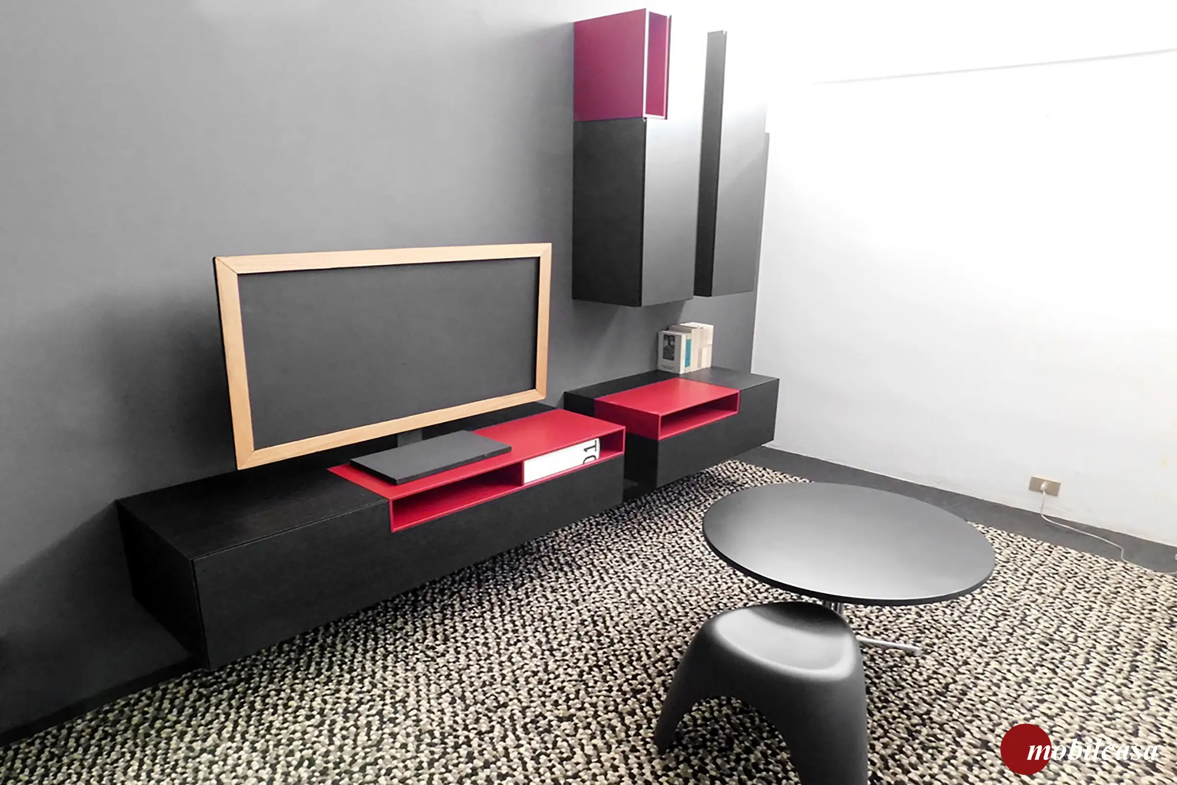 Composizione Inmotion di produzione Mdfitalia. Finiture: frassino laccato nero a poro aperto, inserti a giorni laccati rosso opaco. Componentistica: 1 modulo base sospeso con cassetto e vano a giorno di cm 144x48p.x32h., 1 modulo base sospeso con cassett