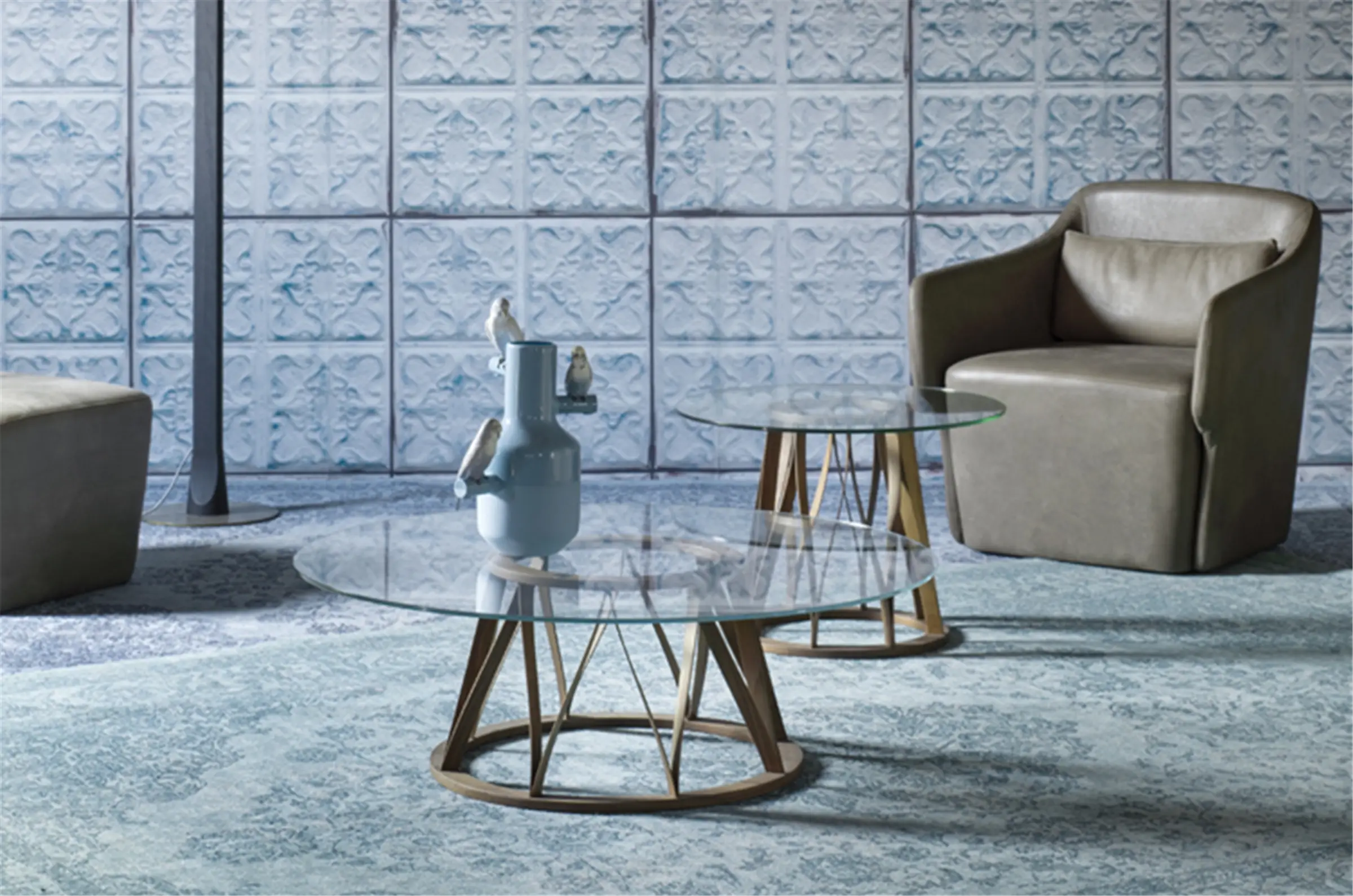 Versione a tavolino dell’omonimo tavolo da pranzo. Il piano in vetro dona un gusto borghese all’ambiente, che viene arricchito dalle sinuose linee della base in legno.