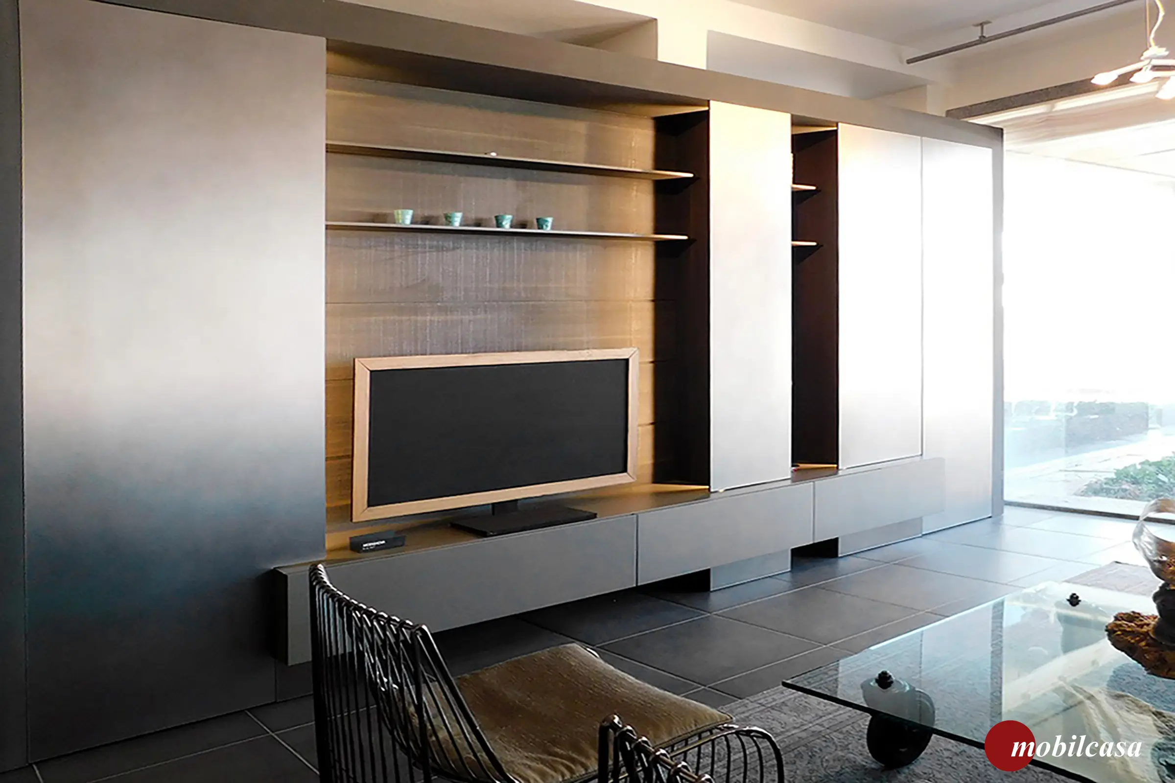 Composizione giorno mod. Blade di produzione Modulova. Le colonne presentano ante sp 1,2 in alluminio alveolare rivestito in finitura Metal Dust. Ogni anta di ciascuna colonna e,erge rispetto alla struttura favorendo un gioco di prospettive con le luci led che sono posizionate sul fianco esterno di ciascuna colonna. La composizione è dotata di pannelli boiserie e mensole in melaminio rovere carbone, le basi sono laccate satinate grigio cendre. Dimensioni: cm. 400,5x 225h.x36/48p.