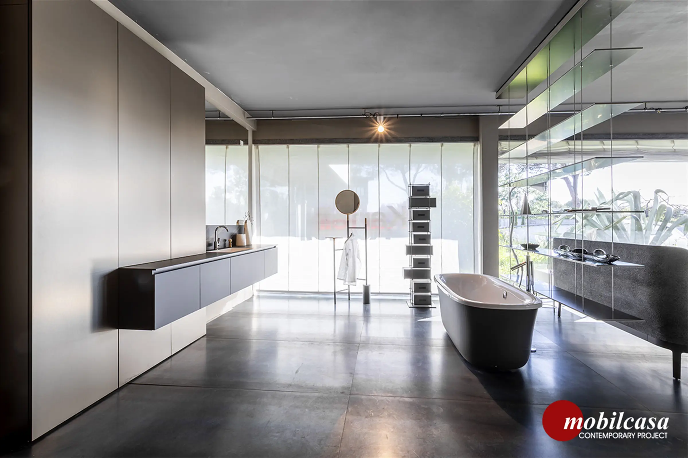 Composizione bagno MH6 di produzione modulnova L. 465 cm, H. 180 cm, P. 22 cm - Colonne con maniglia premi/apri in finitura leaf metal ivory; - Basi con apertura a ribalta in finitura leaf metal ivory; - Specchiera L. 178 cm, H. 150 cm; - Illuminazione integrata nella colonna laterale allo specchio; - Basi/Lavabo in finitura super matt London Grey D72; - Schienale Gres Noir Desir; - Vasca integrata rettangolare 70x31x12 cm in tecnoril bianco opaco