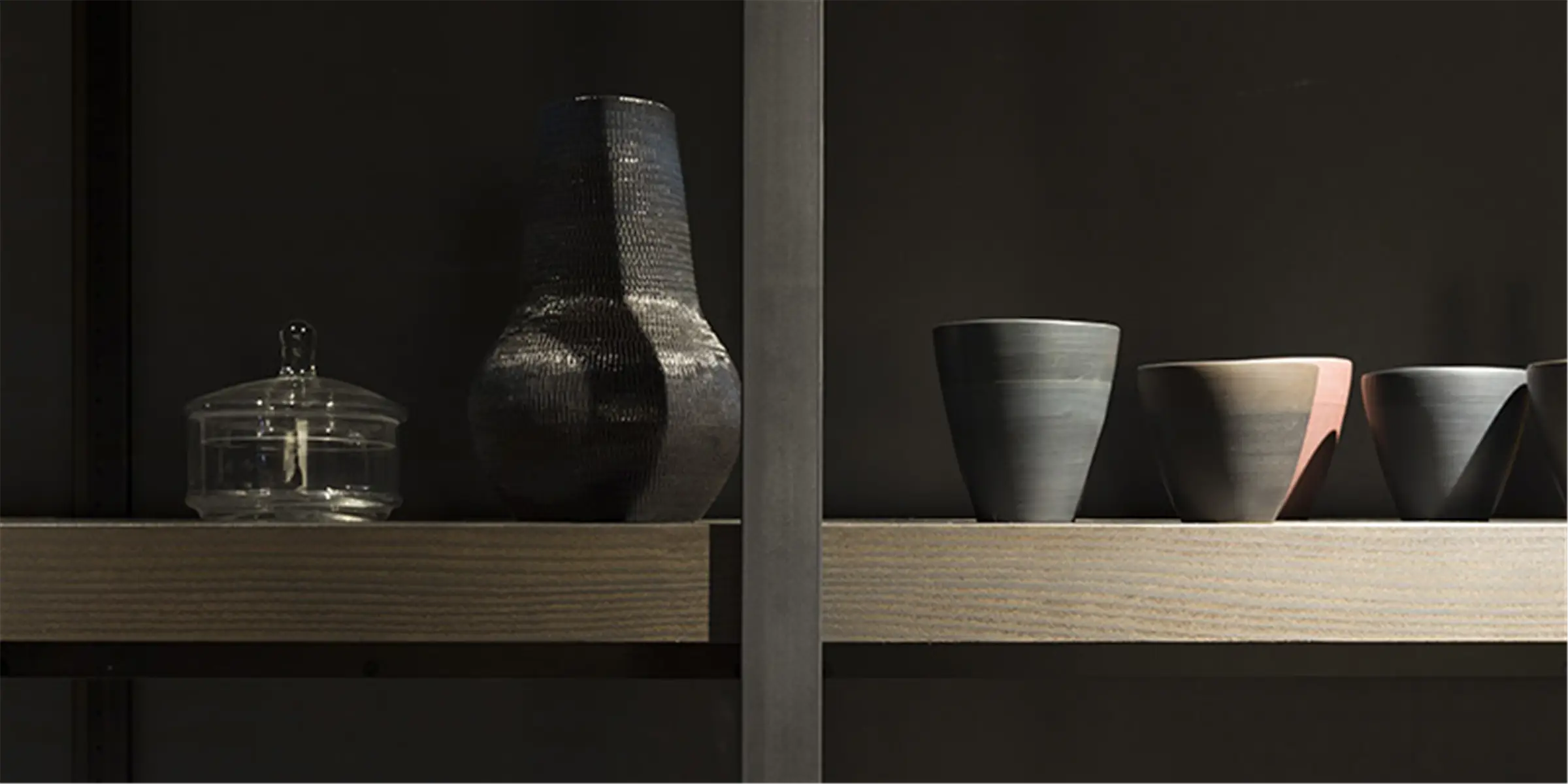 Fly con top in Corian (sp. 3 cm) e basi laccato satinato bianco (disponibili anche in rovere, rovere poro aperto e resina). Le ante sono caratterizzate da uno o più lati con bordi smussati a 45° che se accostati a fianchi e piani controsagomati permettono di creare un monolite senza spessori in vista.