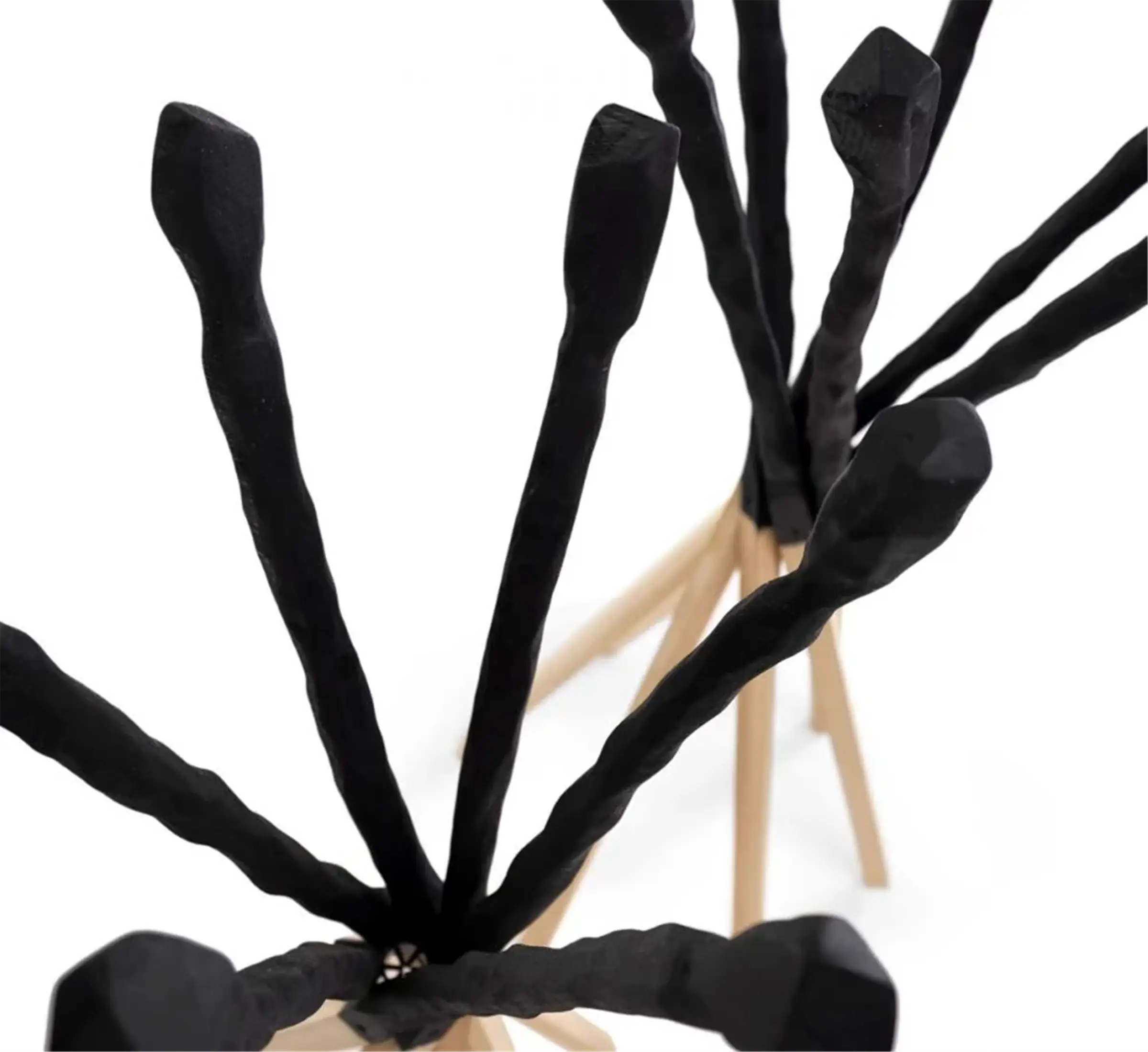 Match è un appendiabiti in massello di faggio in finitura tinto nero e olio naturale. Match vuole ricordare il fiammifero consumato dalla fiamma. Sei bastoncini di legno uniti a comporre un pratico e ironico appendiabiti da terra.