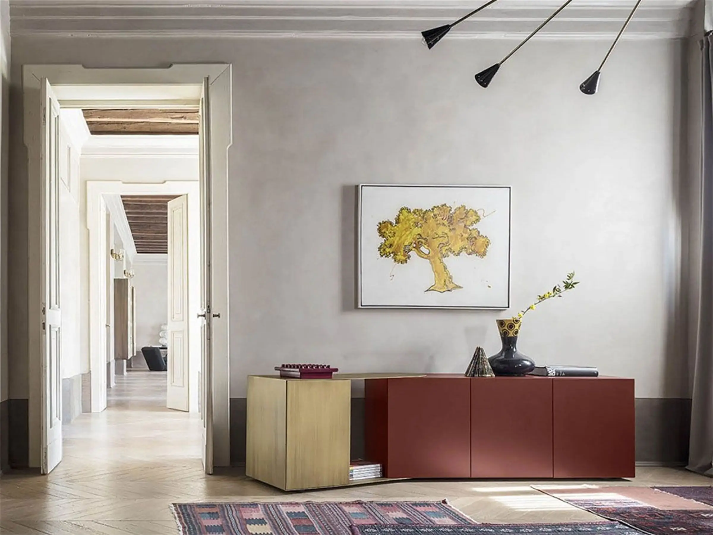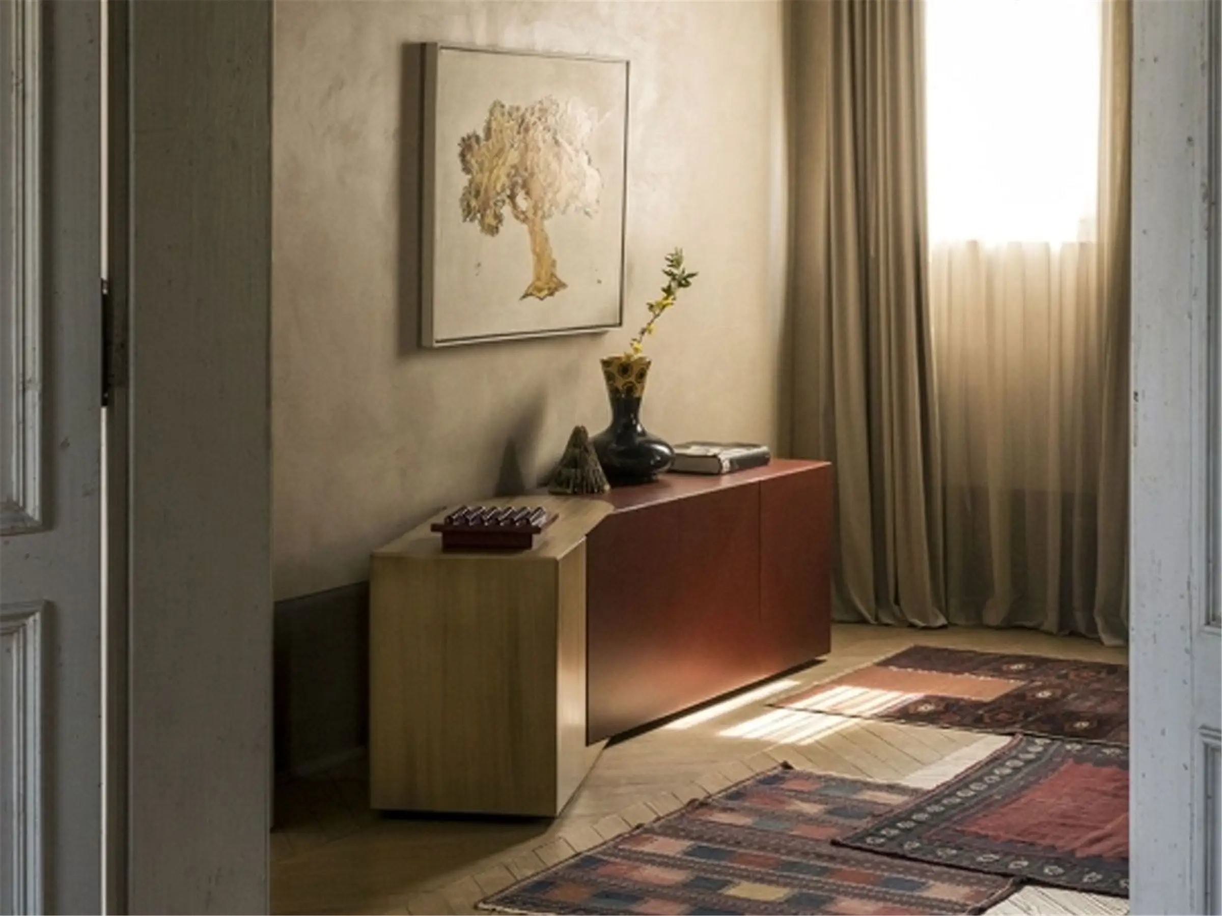 Partout pensile e Partout credenza, sono contenitori con struttura in mdf laccata in tutti i colori come da campionario oppure placcata in legno di Eucalipto affumicato e elemento orientabile in metallo brunito oppure patinato bronzo. Entrambi contenitori dal design lineare e geometrico con volumi aperti e chiusi, possono dare vita sia a forme rettilinee, sia a soluzioni angolari. Difatti grazie all’elemento in metallo orientabile Partout può seguire angoli aperti e angoli chiusi creando continuità sulle pareti.