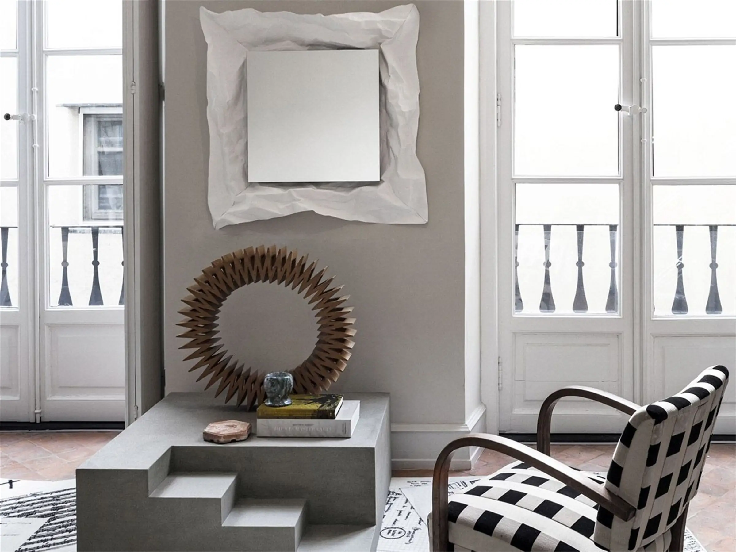 Wow è uno specchio da parete con cornice in feltro di cellulosa sintetica da stropicciare a piacimento disponibile nel colore bianco. Si ispira all'immagine della carta da regalo stropicciata; il risultato è un oggetto sempre diverso perché stropicciata dal suo fruitore. Disponibile in 3 misure.