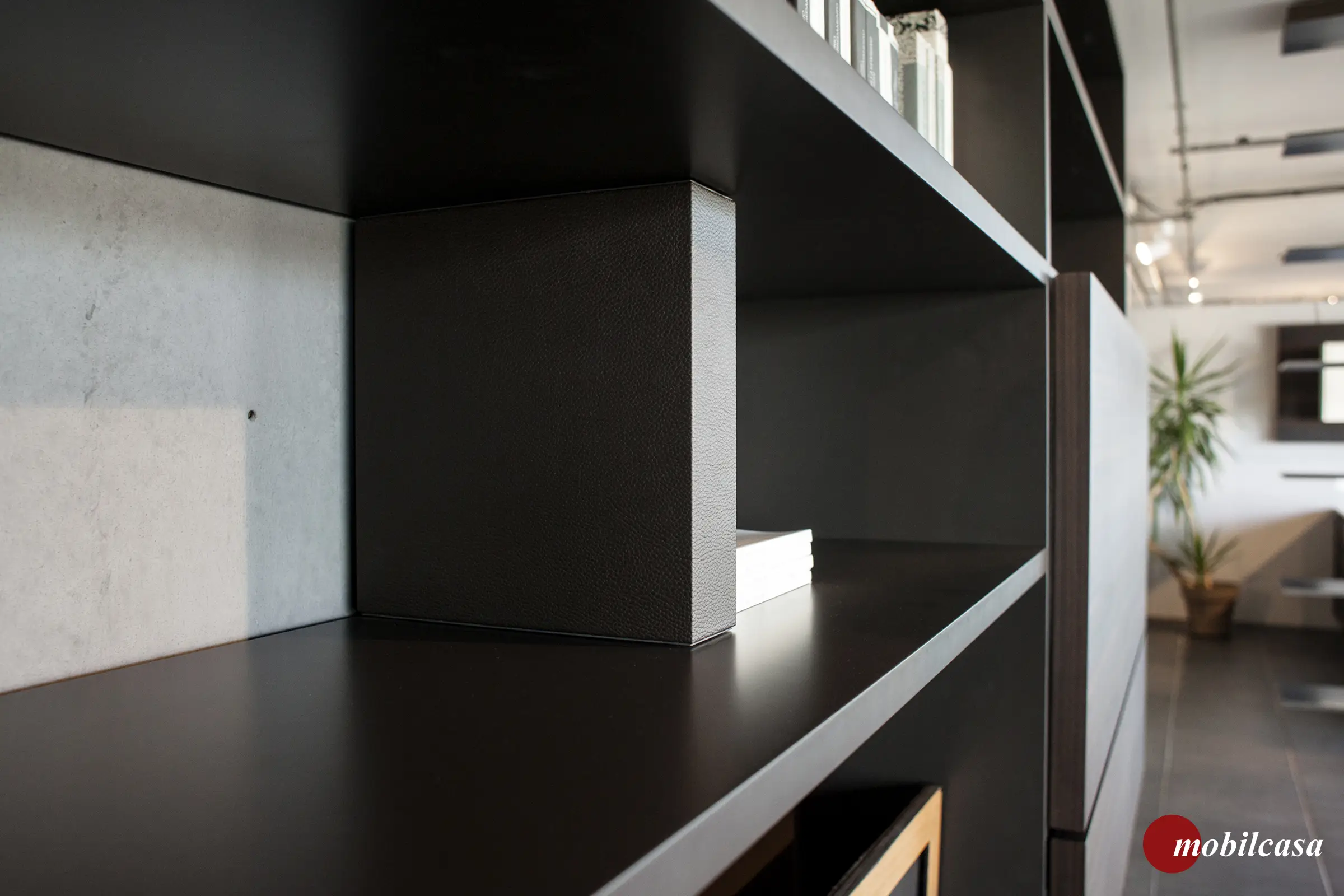 libreria, mobile polifunzione L. 271, P. 47, H. 232 cm struttura moka opaco, divisori in ecoskin testa di moro, specchio bronzo e ribalta e saliscendi in legno eucalipto.