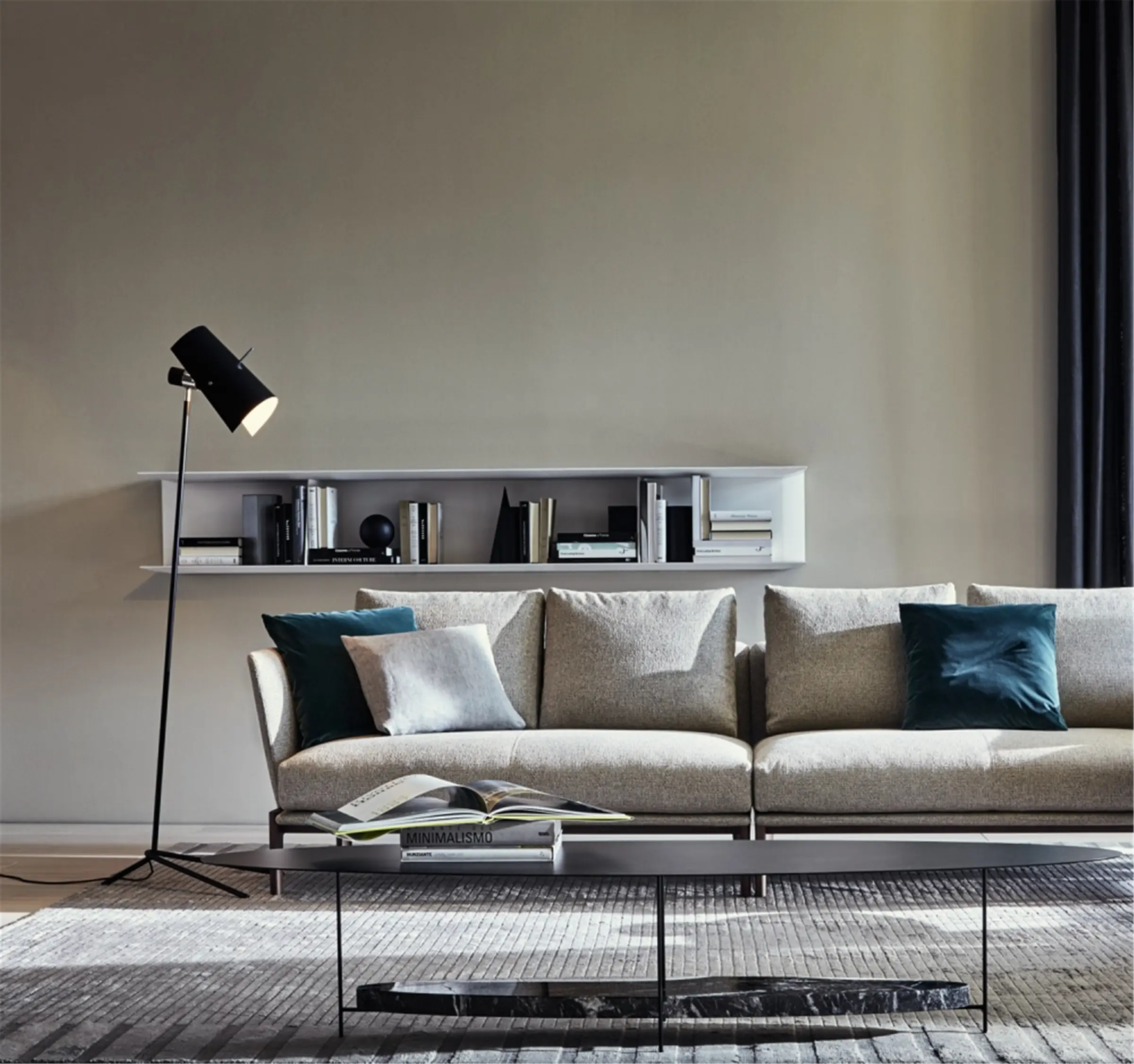 Libreria sospesa disegnata nel 1955, presente anche in casa Ponti in via Dezza a Milano. Realizzata in multistrato sagomato con rivestimento di olmo, in parte con finitura trasparente naturale, in parte verniciata a mano in colore bianco con divisori che richiamano la libreria D.357