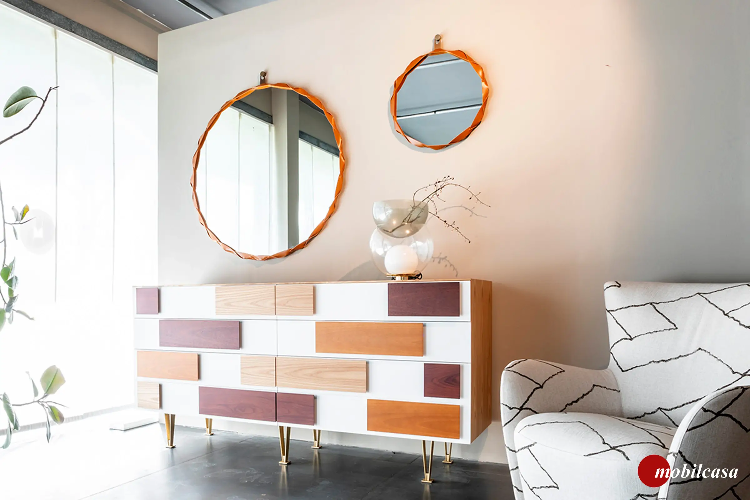 L.195 cm, P.52 cm, h. 89,9 cm È caratterizzato dai frontali dei cassetti verniciati a mano in colore bianco con maniglie applicate di varie essenze (olmo, noce nazionale, mogano e palissandro). Comò disegnato in diverse varianti tra il 1952 e il 1955, la riedizione è prodotta sulla base dei disegni originali custoditi nei Gio Ponti Archives e la direzione artistica dello Studio Cerri & Associati per la Gio Ponti Collection. La struttura in essenza di olmo è sostenuta da piedi in ottone satinato.