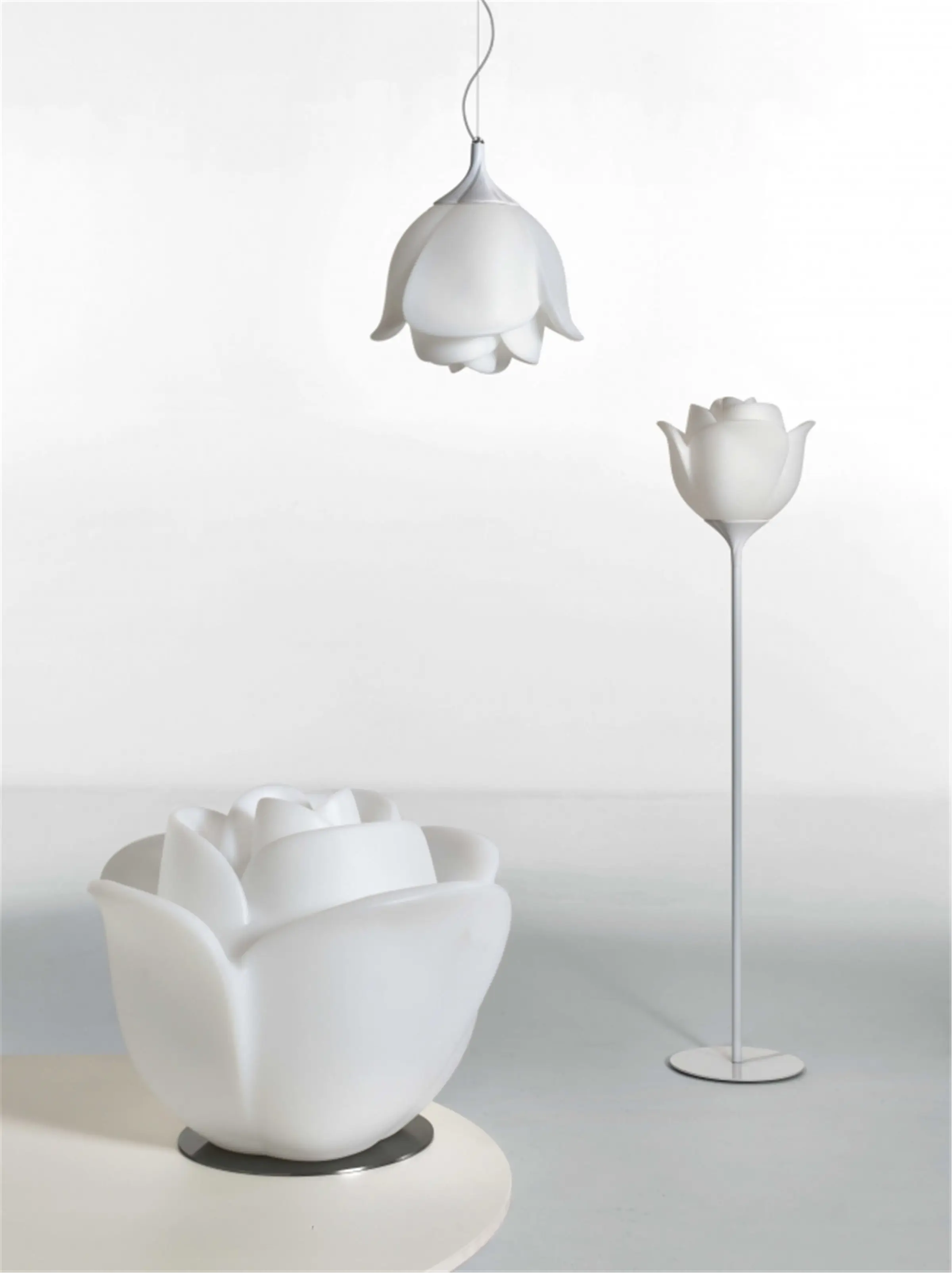 Il design della lampada a sospensione Baby Love è ispirato alle forme di una rosa. Si tratta di un fiore luminoso in polietilene che decora e valorizza gli ambienti in cui è collocato.