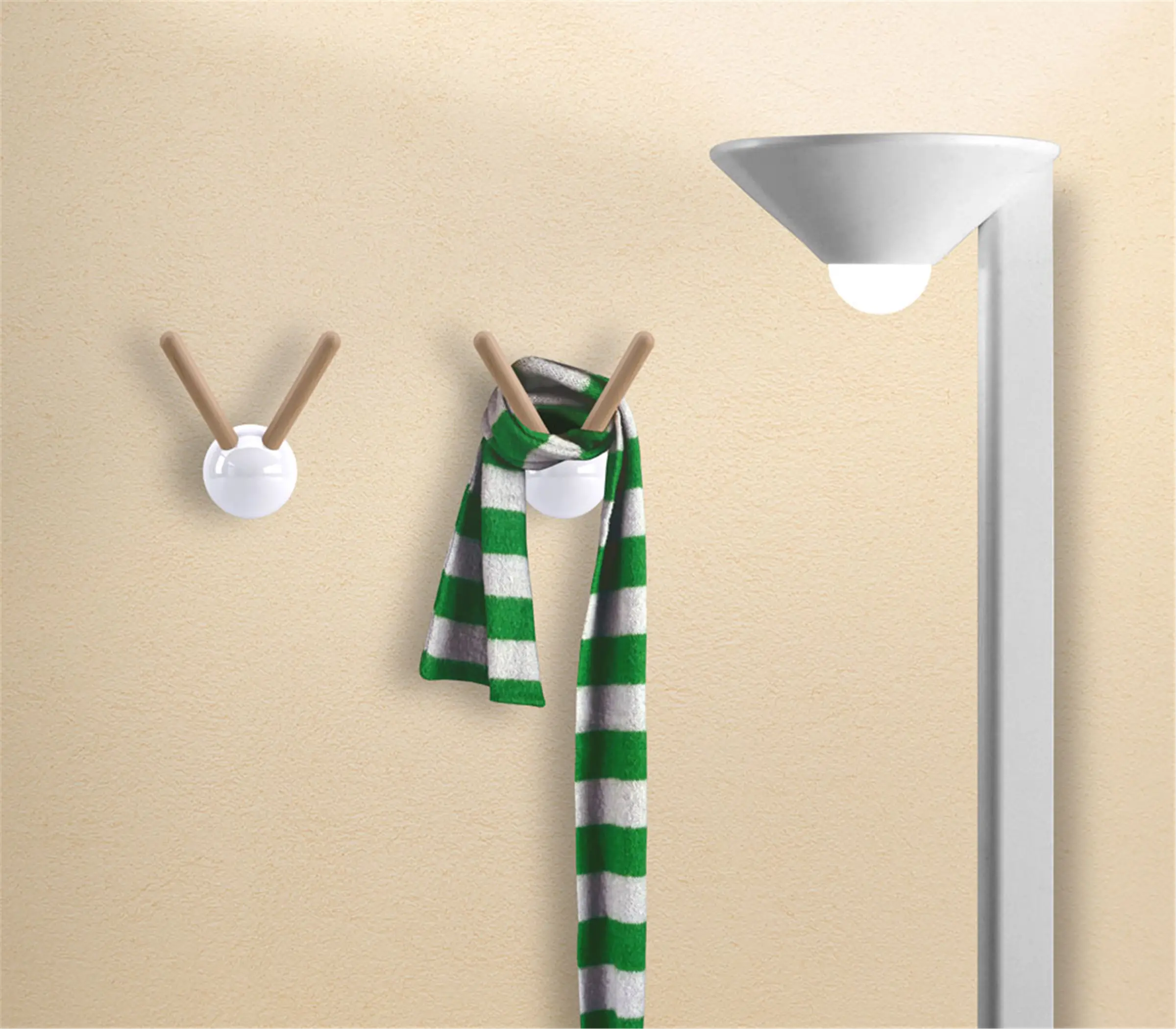 Simpatico appendiabiti da parete, figlio naturale dell’appendiabiti da terra Tepee, la cui inconfondibile sfera per l’occasione si dimezza, così mantenendo inalterata la sua iconica immagine di grande eleganza.