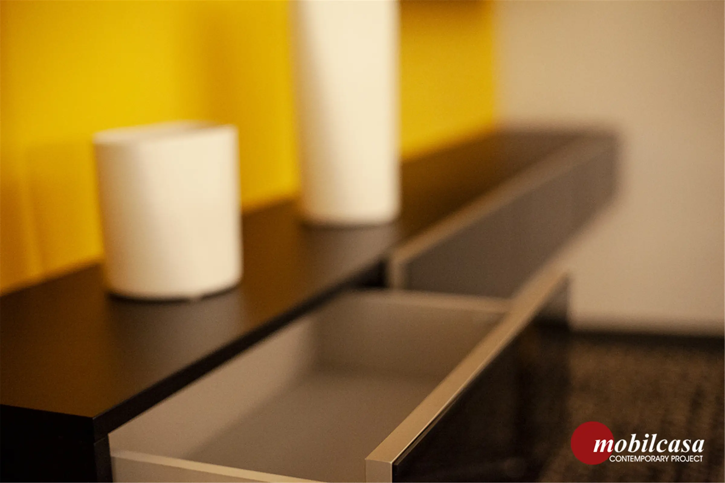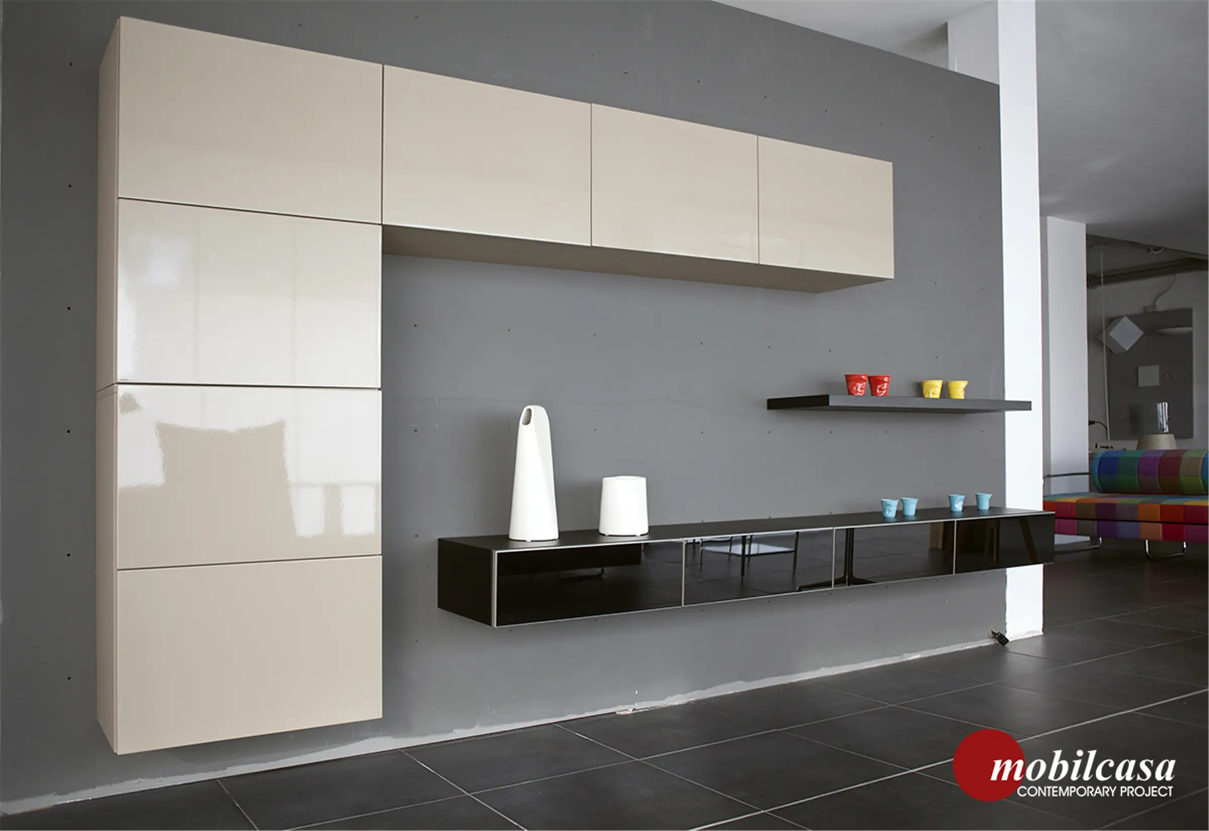 Composizione con struttura laccato seta grigio tortora, ante sp. 2 laccato lucido grigio tortora , cassetti sp. 2 vetro retroverniciato nero con profilo alluminio anodizzato naturale,mensola sp. 4 laccato seta nero 727. Apertura premi apri.
