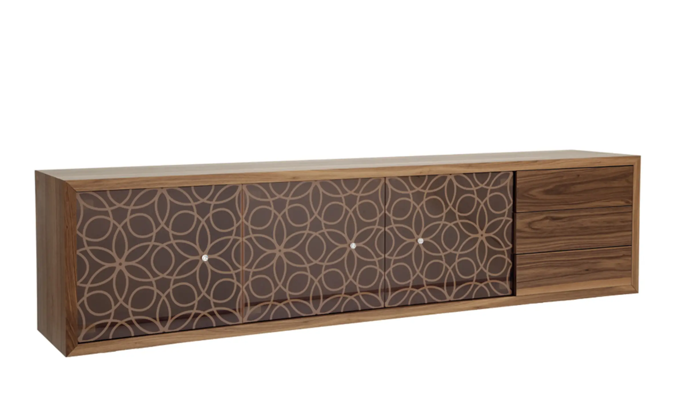 Strutture in legno, antine di cristallo serigrafato e maniglie Swarowski® ispirate a preziosi diamanti: il design si traforma in gioiello.