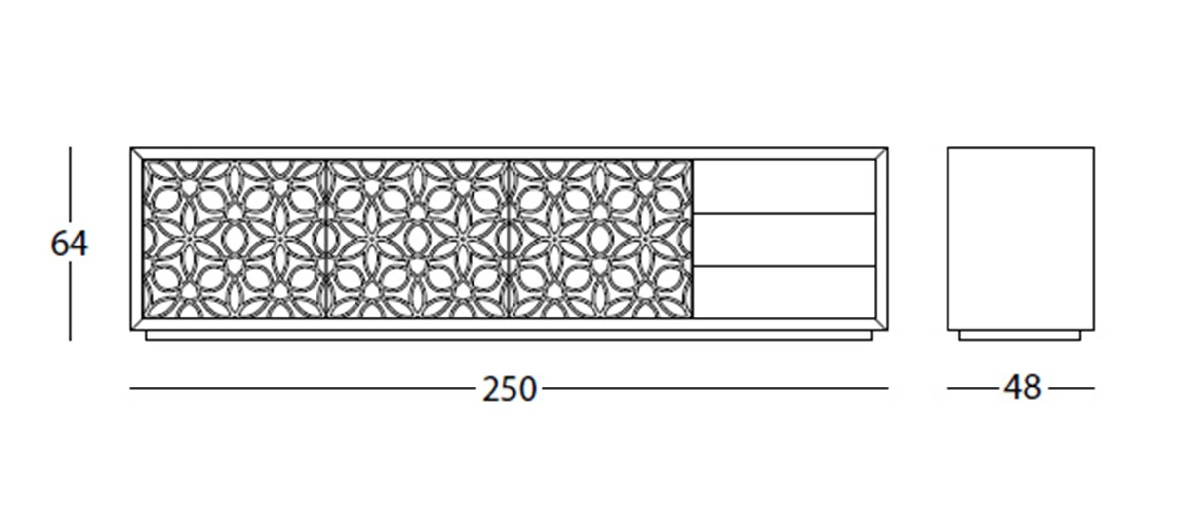 Madia contenitore in legno, con 3 ante in vetro con pomoli Swarowski®, e 3 cassetti in legno. Ripiani interni in vetro bronze trasparente.