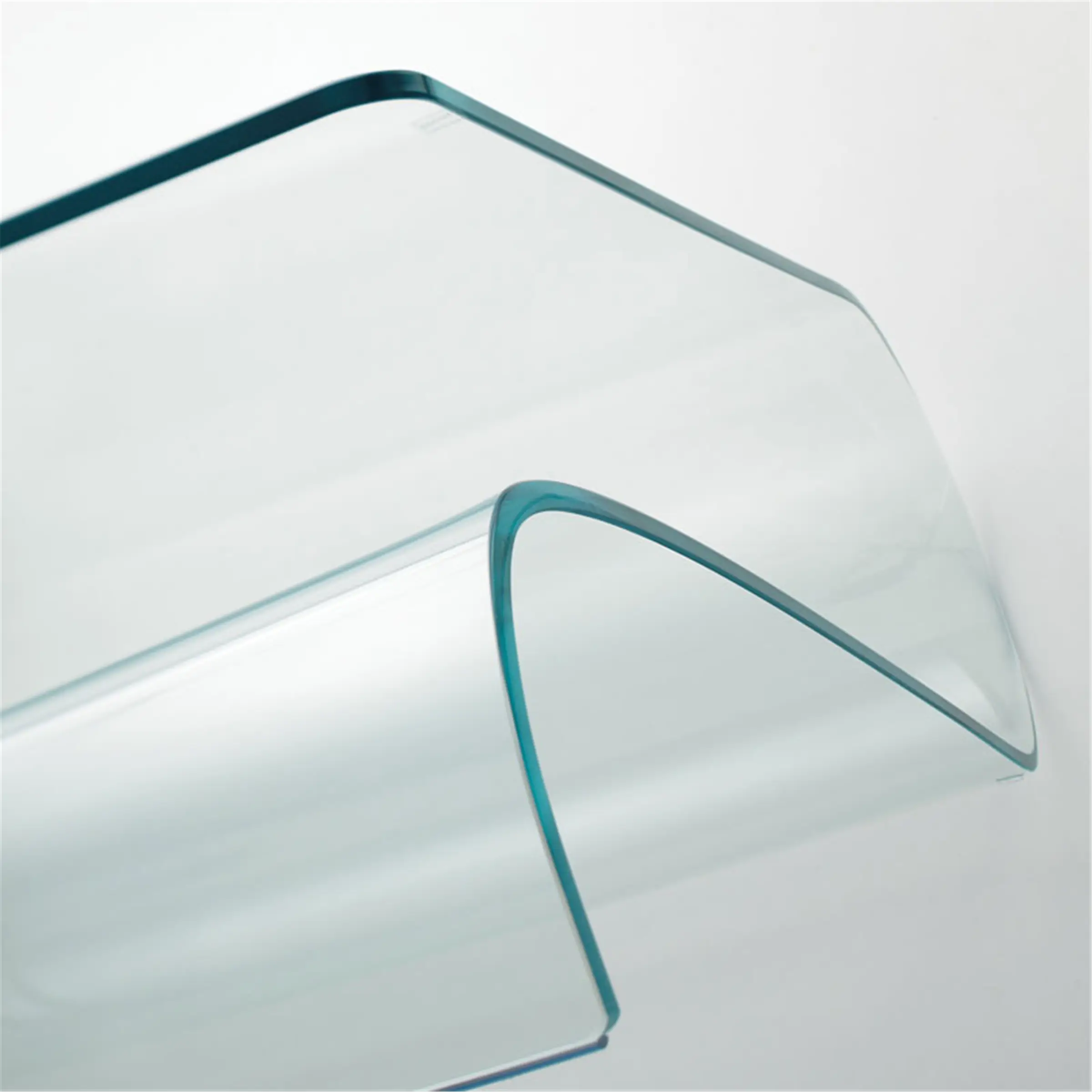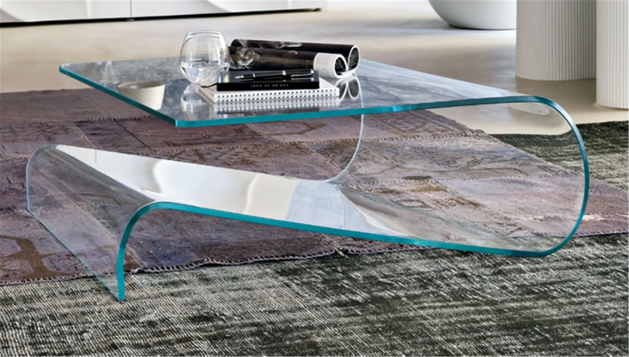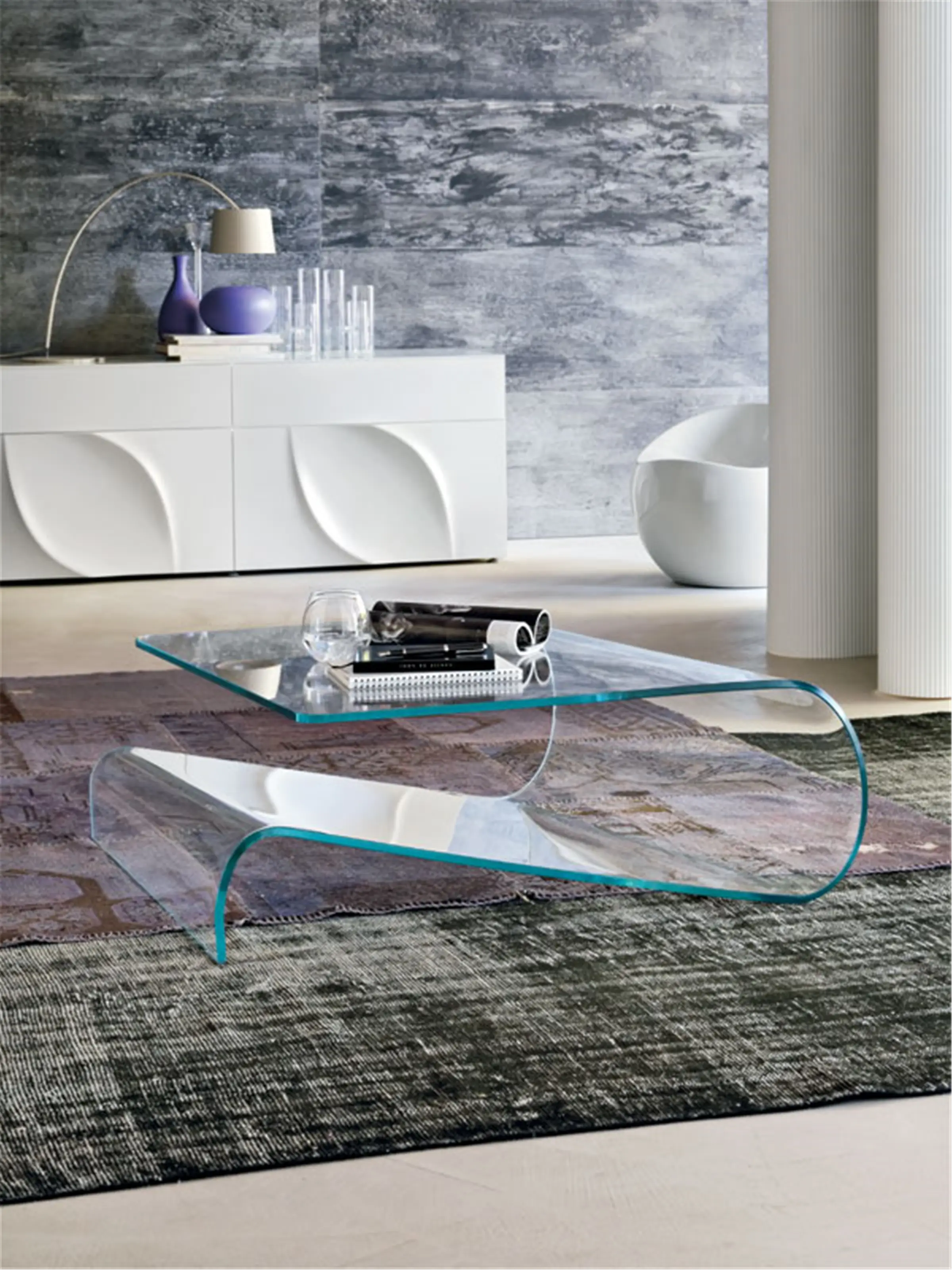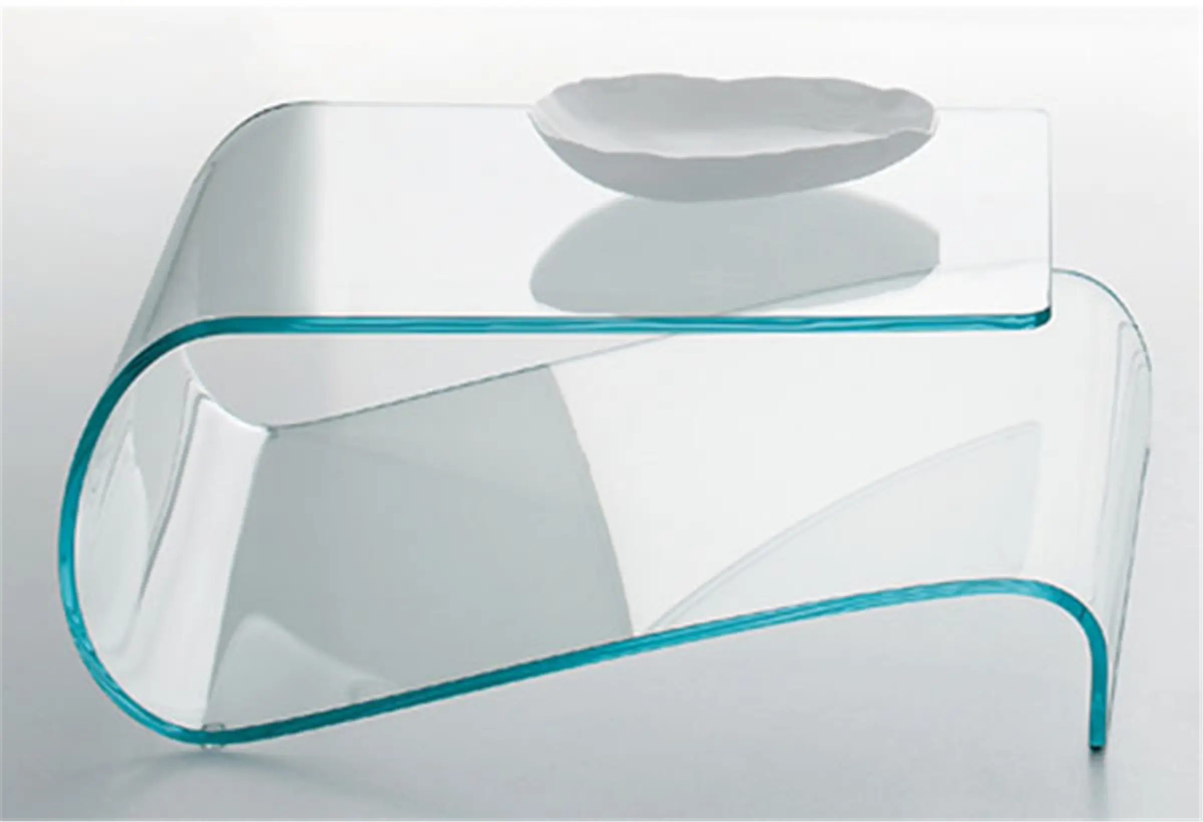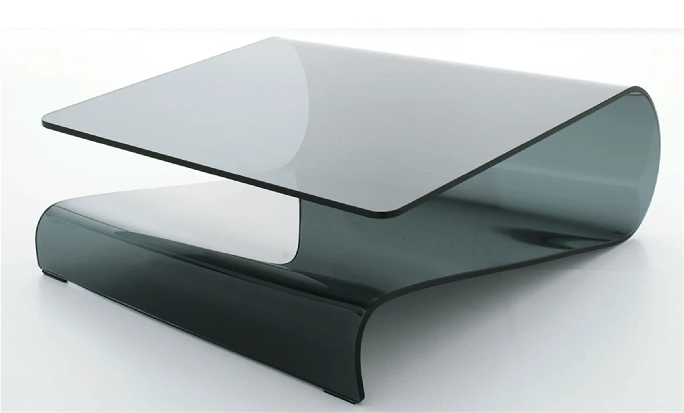 Tavolino in vetro curvo dalle forme morbide realizzato con tecniche speciali di curvatura, disponibile in vari colori a scelta.