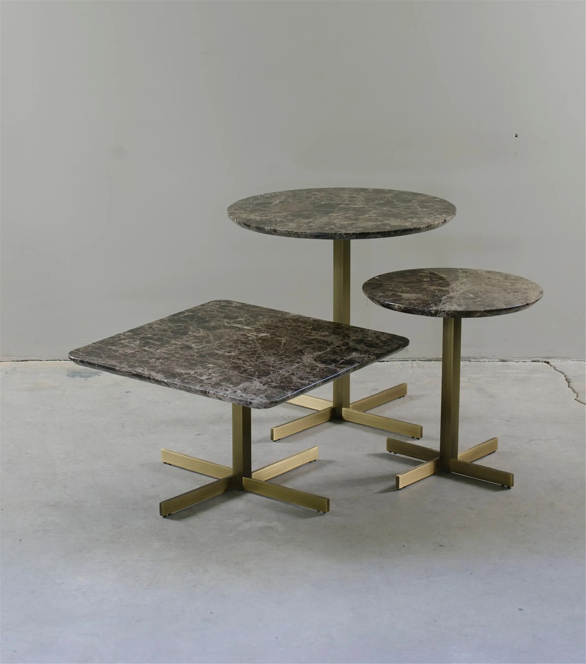 Serie tavolini/comodini XO con base in ottone OT58 mm 30x10, disponibili nelle finiture a campionario: satinato, bronzato, lucido e naturale/grezzo. Top in lamiera di ferro mm 3 verniciata nelle finiture a campionario. Possibilità di top da mm 20 in marmo bianco carrara, nero marquina o dark emperador. Il marmo essendo un materiale naturale può presentare delle particolarità come venature, lievi irregolarità superficiali, piccoli forellini, colorazioni ed inclusioni di vario tipo che non devono essere considerati dei difetti bensì pregi che ne esaltano l’unicità del prodotto.