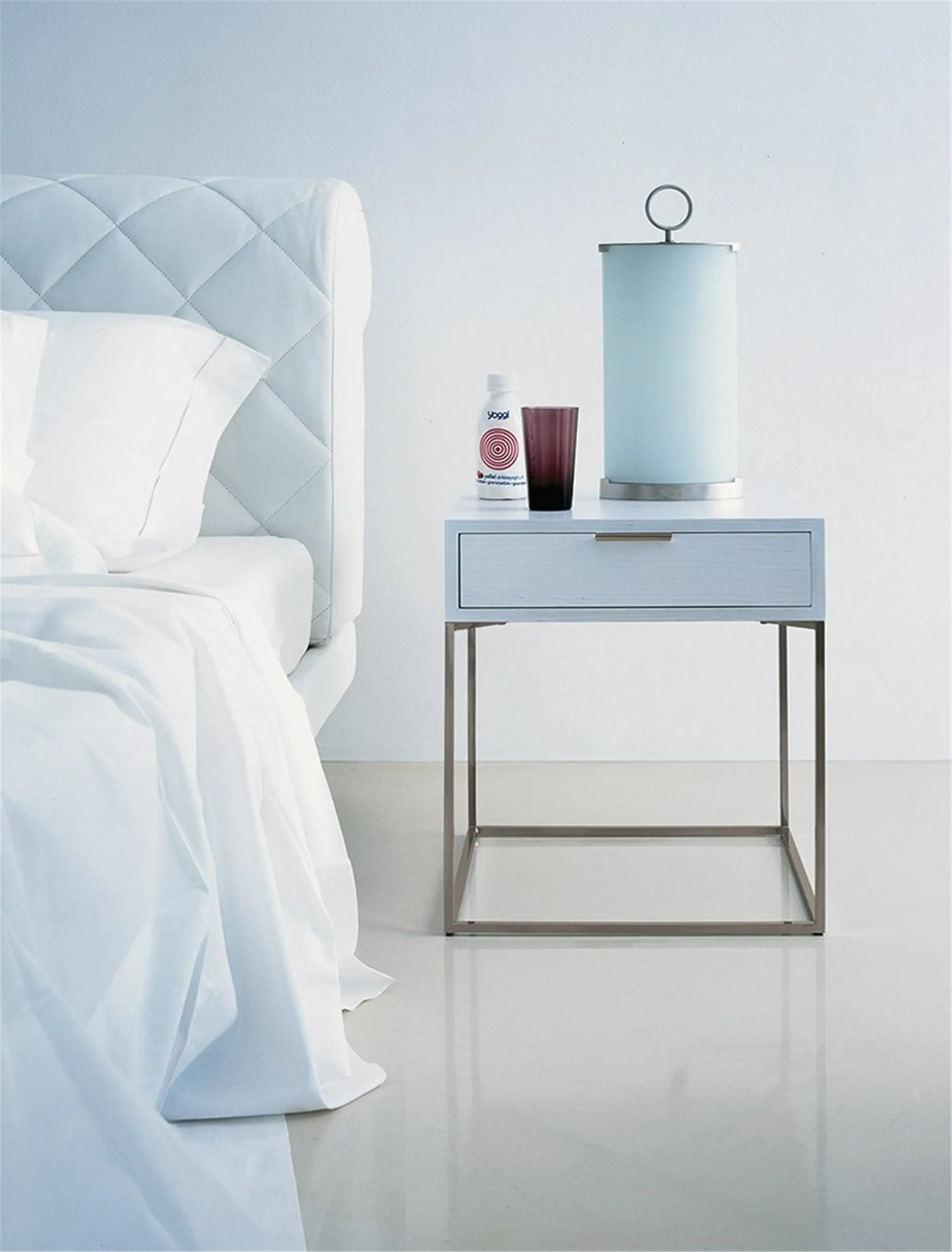 Comodino con cassetto. Struttura in acciaio verniciato colore grafite. Maniglia in alluminio verniciato colore grafite. Cassetto in medium density fiberboard impiallacciato in rovere naturale, tinto grigio o bianco.