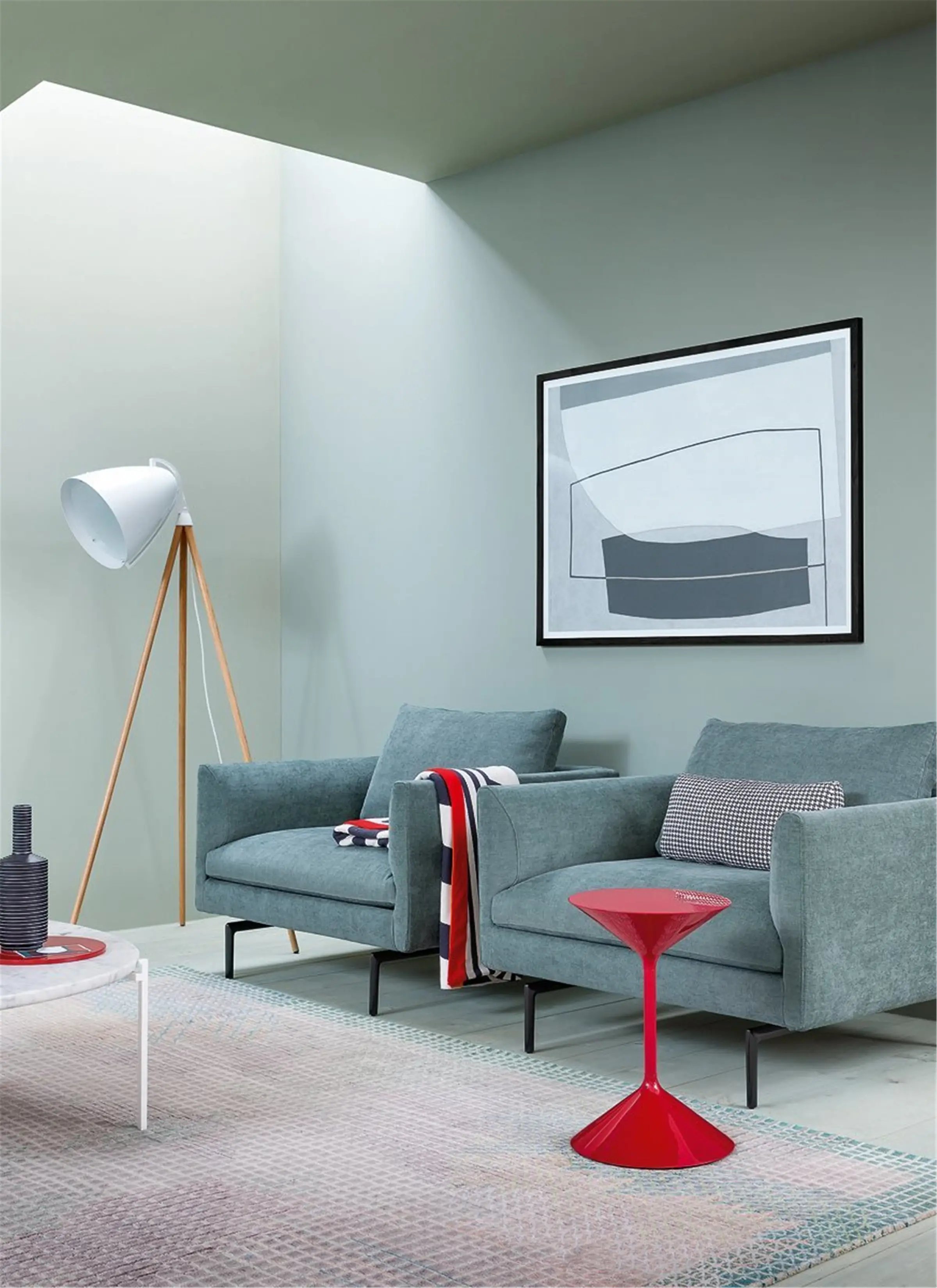Tavolino. Coni in poliuretano rigido, asta di sostegno in acciaio, laccatura lucida nei colori della cartella.