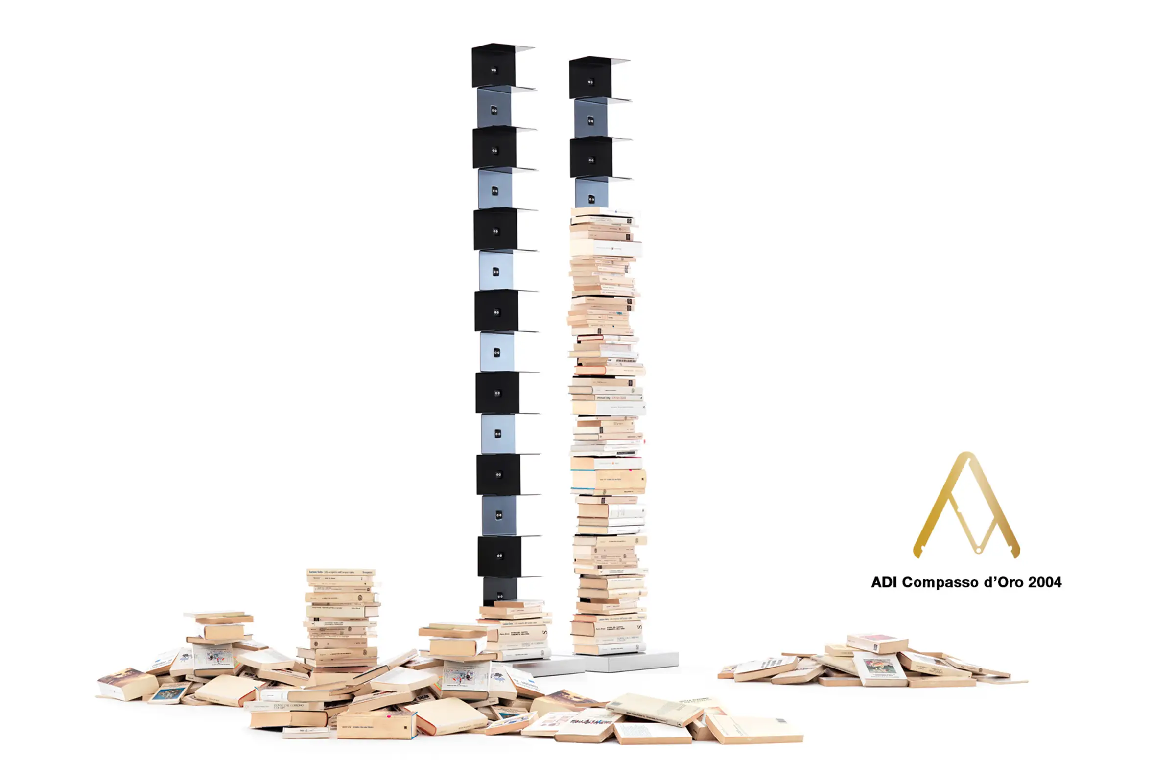 Disegnata da Bruno Rainaldi per Opinion Ciatti, la Originale Ptolomeo è una libreria verticale self standing con struttura e mensole in metallo nero, acciaio inox lucido (Interno mensole in finitura satinato), laccato bianco o metallo grezzo.